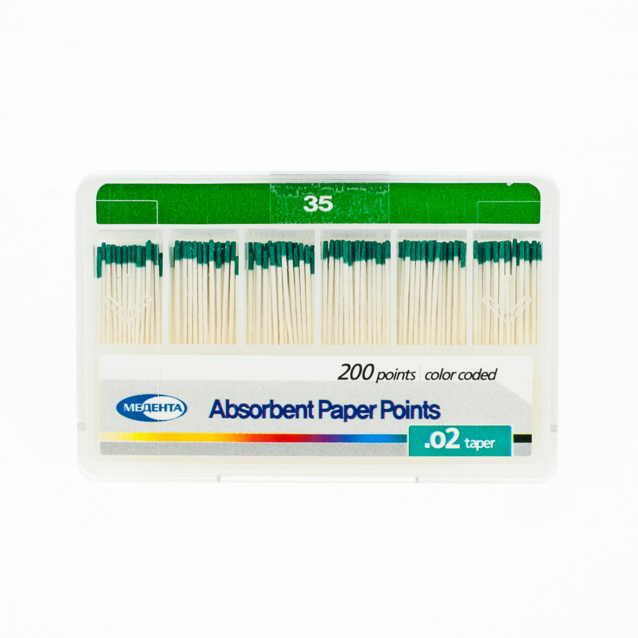 Штифты эндоканальные абсорбирующие бумажные Медента .02 №35 от компании Мета Биомед предназначены для высушивания полости корневого канала зуба перед обтурацией и пломбированием с целью лучшей адаптации и равномерной полимеризации пломбировочного и герметизирующего материала. Бумажные штифты Мета также могут применяться для внесения пломбировочного силера в корневой канал.
