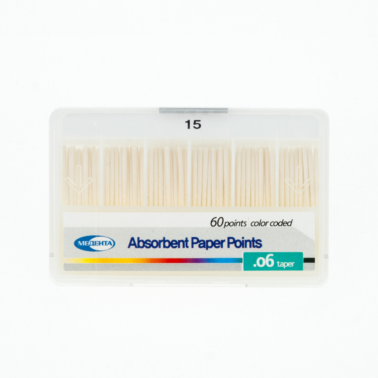 Штифты эндоканальные абсорбирующие бумажные Медента .06 №15 от компании Мета Биомед предназначены для высушивания полости корневого канала зуба перед обтурацией и пломбированием с целью лучшей адаптации и равномерной полимеризации пломбировочного и герметизирующего материала. Бумажные штифты Мета также могут применяться для внесения пломбировочного силера в корневой канал.