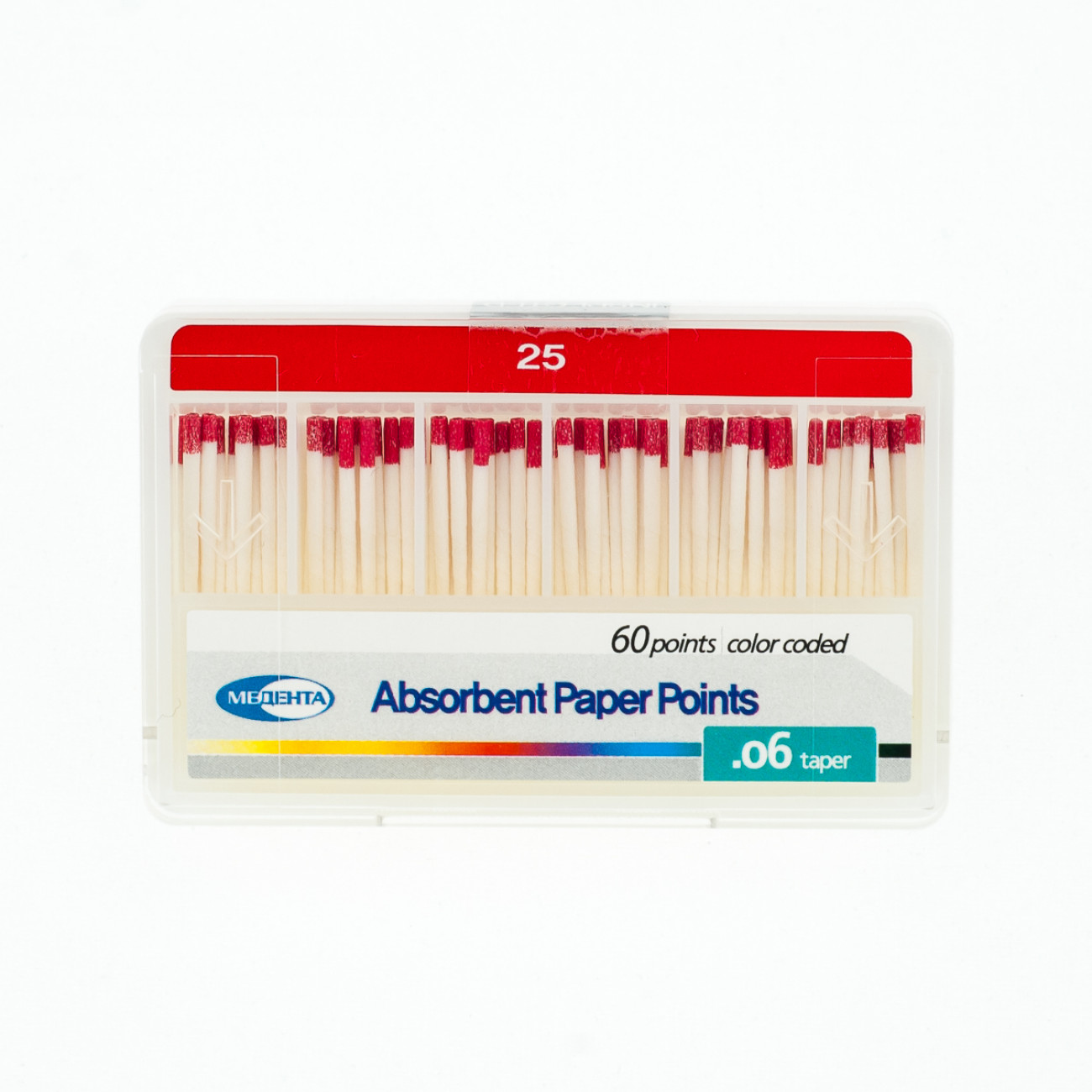 Штифты эндоканальные абсорбирующие бумажные Медента .06 №25 от компании Мета Биомед предназначены для высушивания полости корневого канала зуба перед обтурацией и пломбированием с целью лучшей адаптации и равномерной полимеризации пломбировочного и герметизирующего материала. Бумажные штифты Мета также могут применяться для внесения пломбировочного силера в корневой канал.