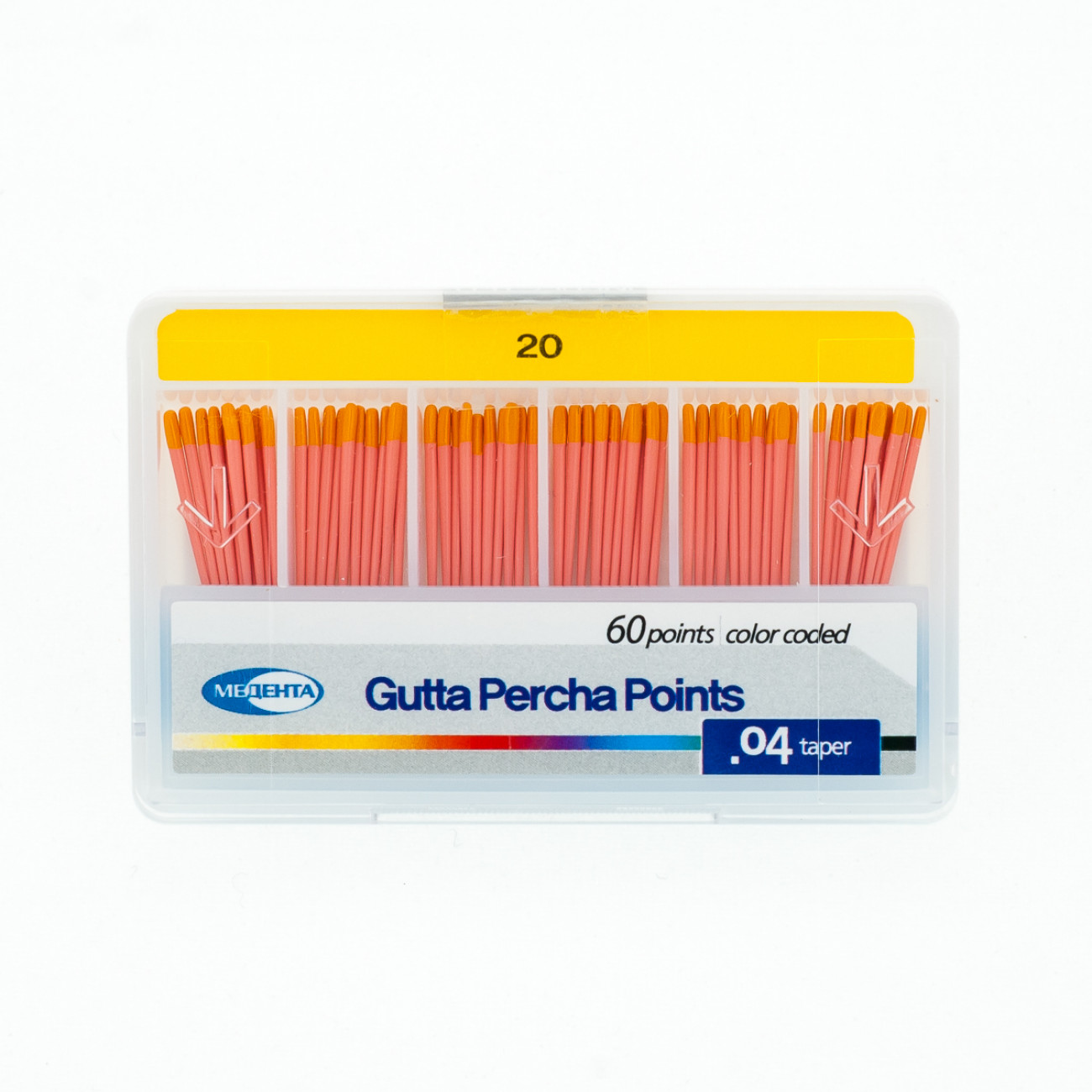 Штифты гуттаперчевые эндоканальные Медента .04 №20 используются для пломбирования корневых каналов зубов методами одиночного штифта и вертикальной конденсации при проведении эндодонтического лечения.