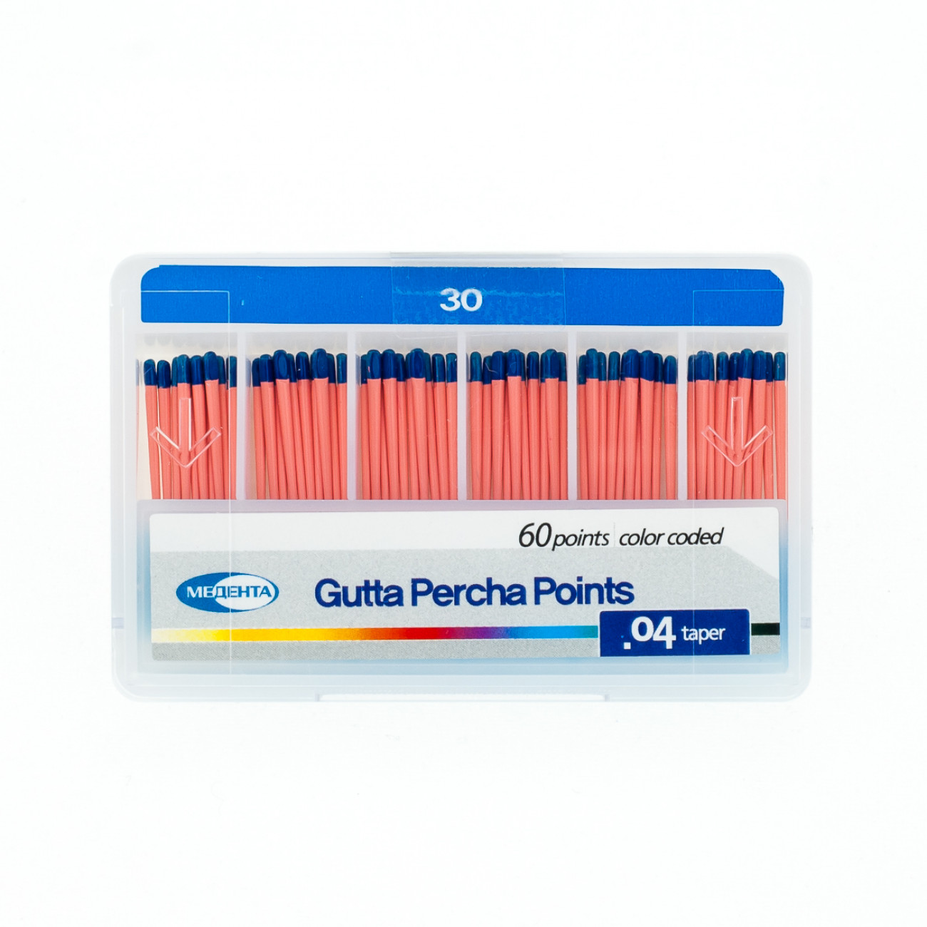 Штифты гуттаперчевые эндоканальные Медента .04 №30 используются для пломбирования корневых каналов зубов методами одиночного штифта и вертикальной конденсации при проведении эндодонтического лечения.