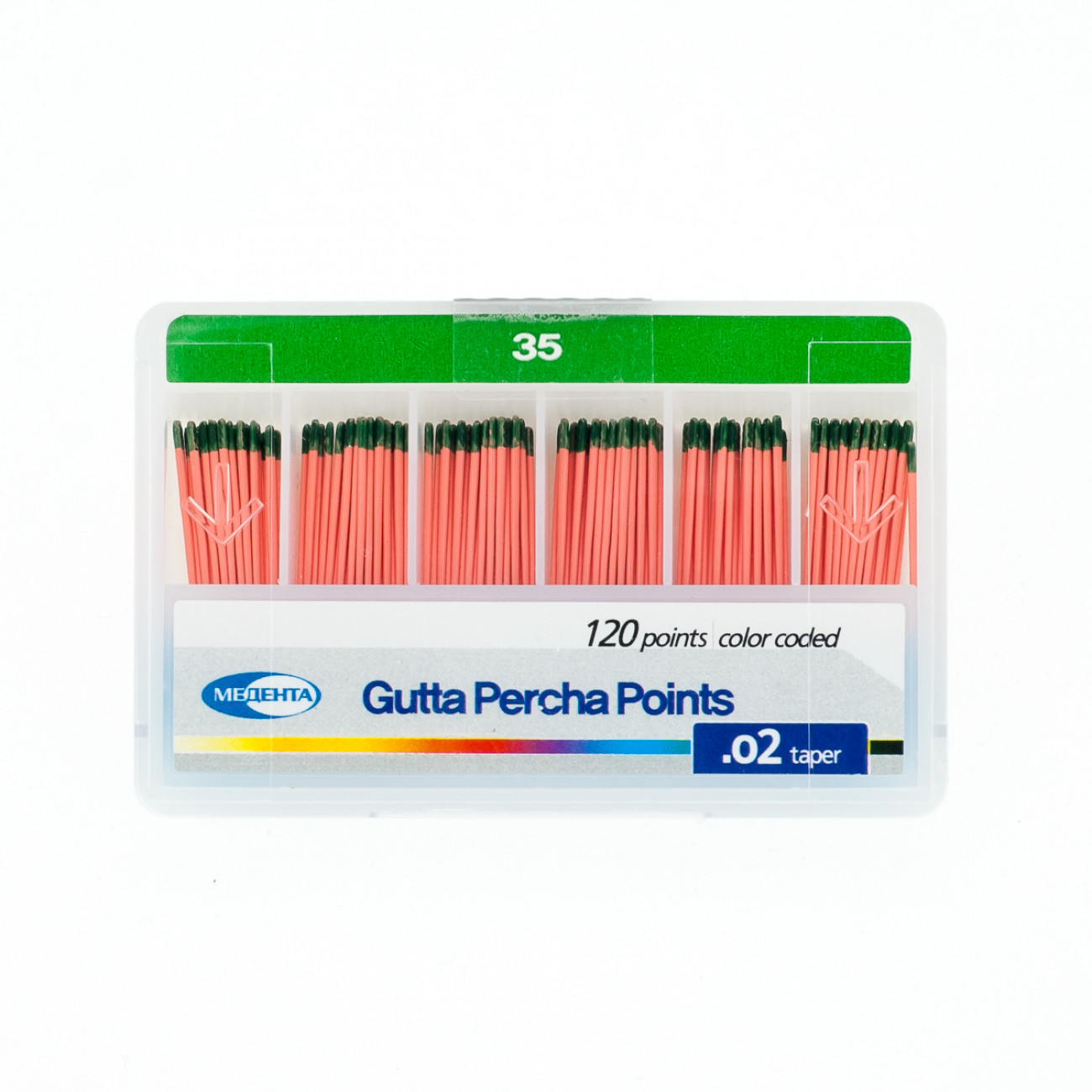 Штифты гуттаперчевые эндоканальные Медента .02 №35 используются для пломбирования корневых каналов зубов методом латеральной конденсации при проведении эндодонтического лечения.
