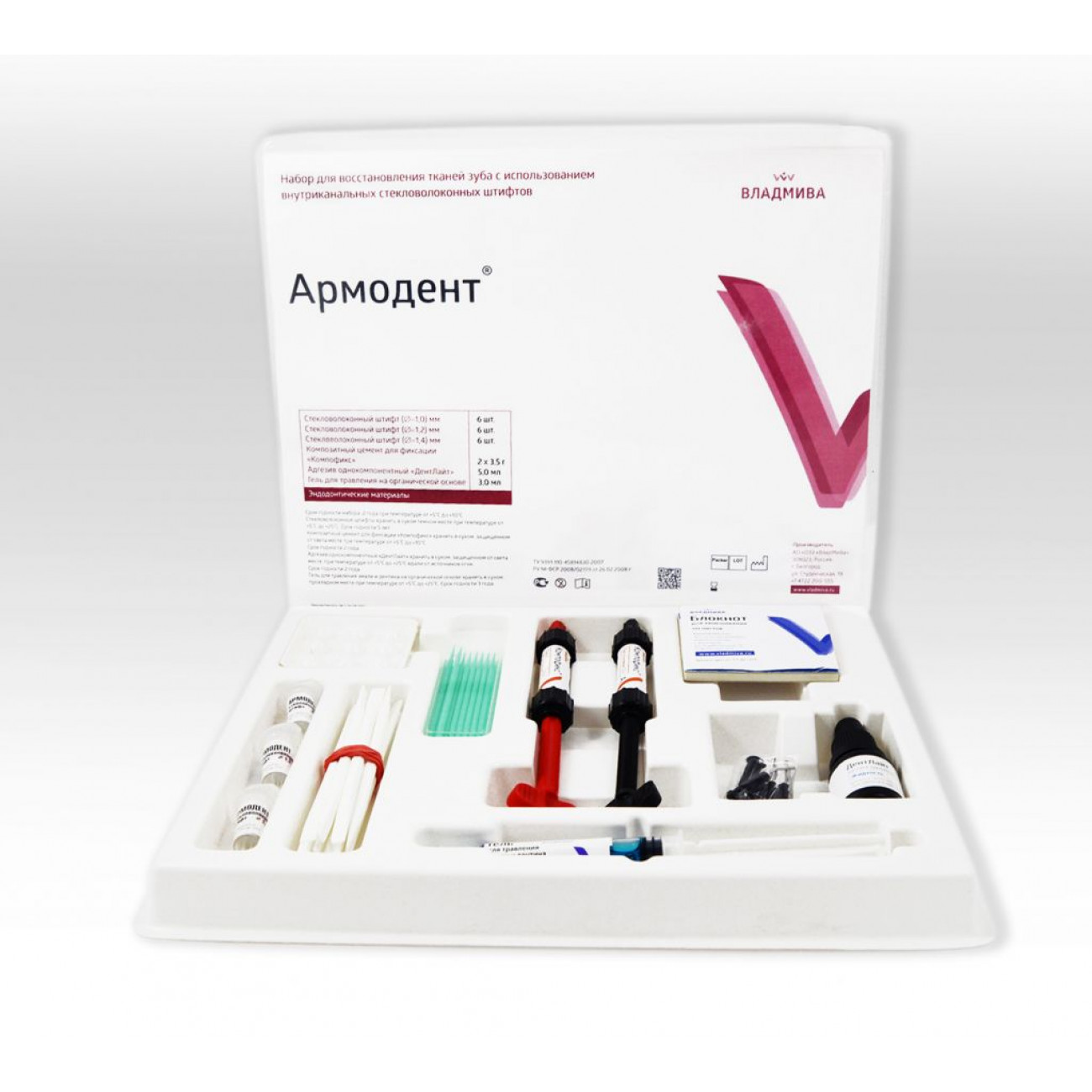 Набор «Армодент» предназначен для восстановления и усиления коронки зуба стекловолоконными внутриканальными штифтами после эндодонтического лечения (при небольшом наддесневом дефекте одной из стенок зуба) и перед протезированием. Рекомендуется применять сразу после депульпирования