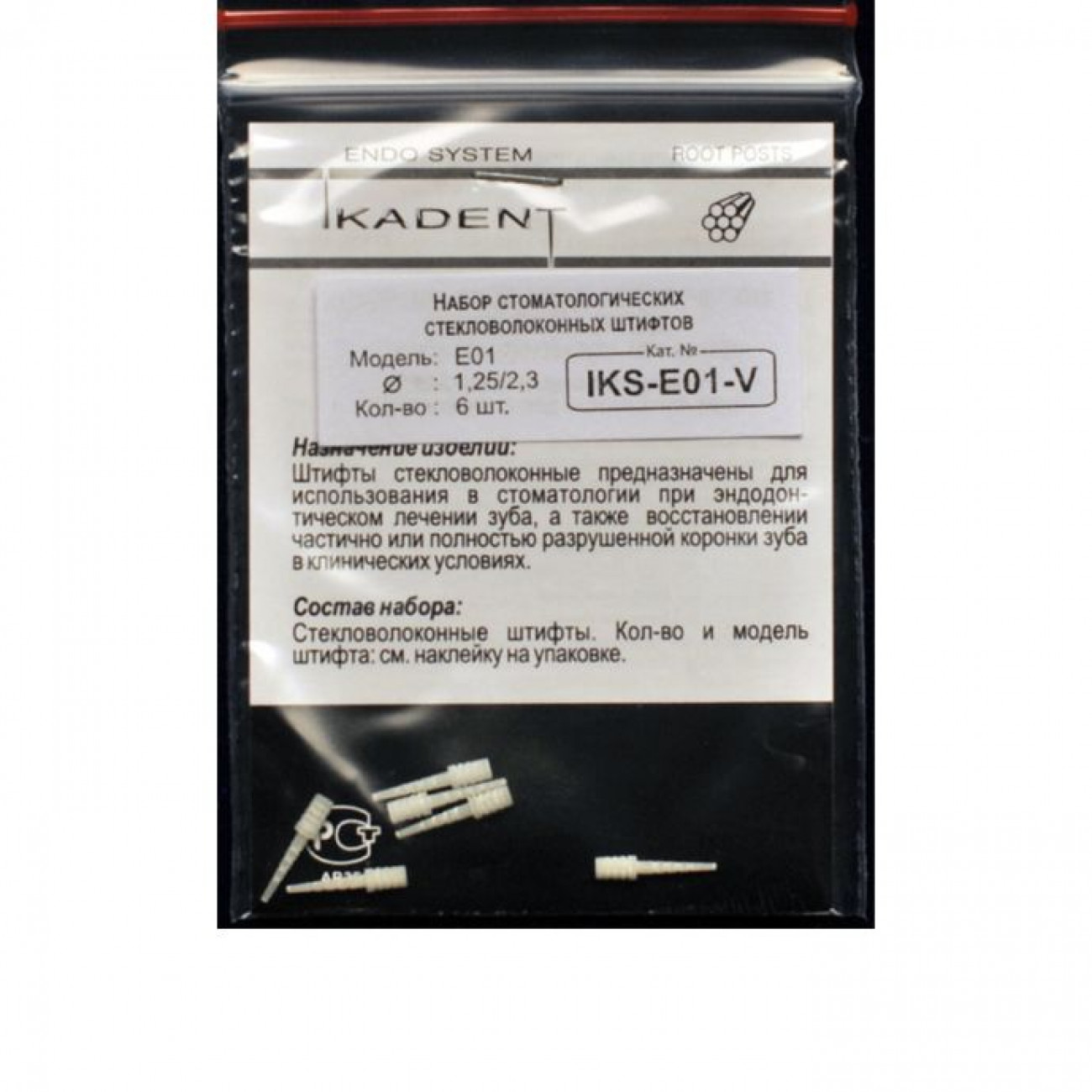 Эндоканальные штифты «IKADENT» применяются в качестве армирующего (усиливающего) элемента для эстетической реставрации частично разрушенной коронки зуба при эндодонтическом лечении. Эти штифты используются во всех группах зубов при сохранении минимум двух стенок естественной коронки. В силу отсутствия плеча (опорного элемента) штифты не предназначены для композитных реставраций при значительном повреждении или полной утрате естественной коронки, а также крепления на них металлокерамических коронок, мостов и прочих объемных конструкций.