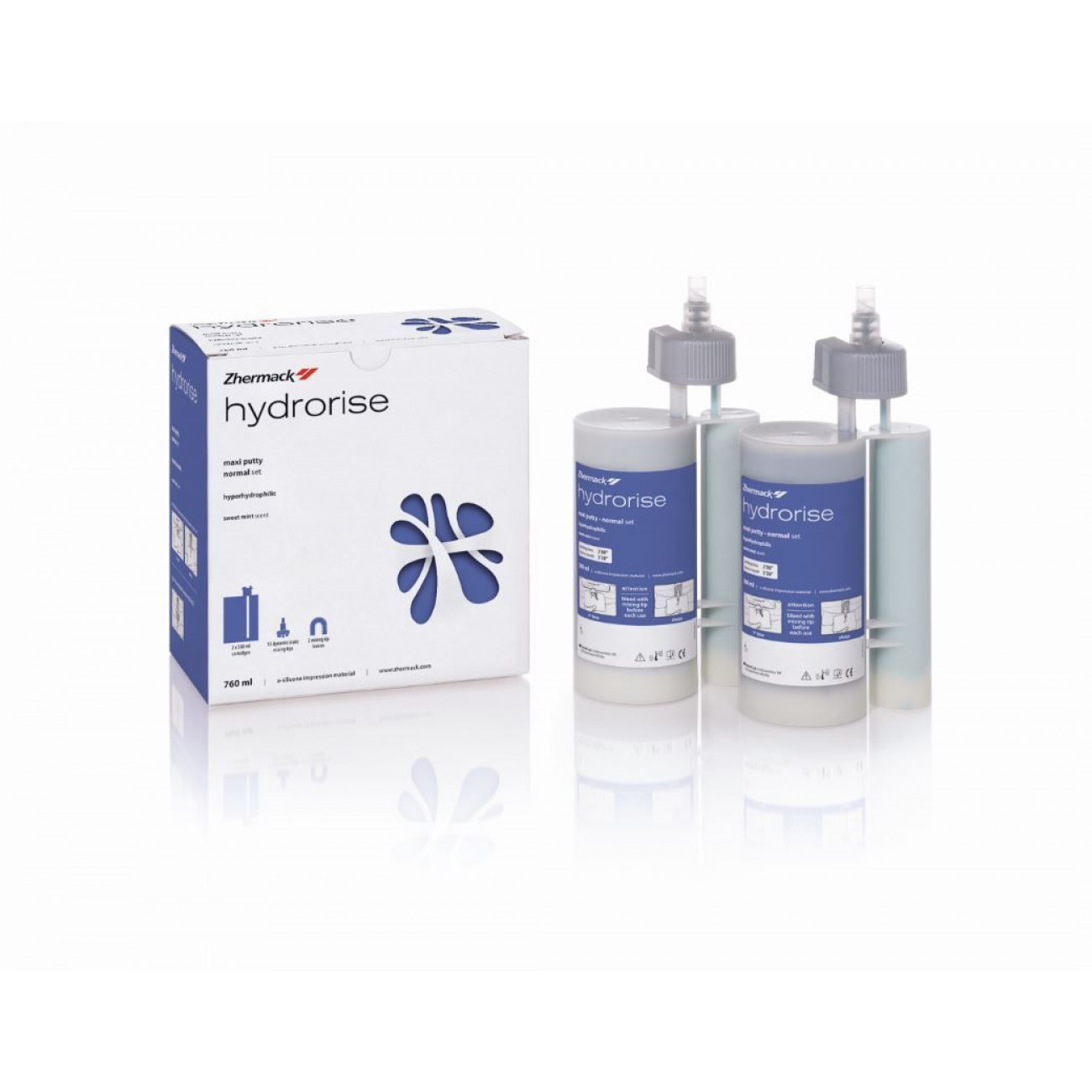 Гипергидрофильный А-силикон очень высокой вязкости обычного отверждения Hydrorise® Maxi Putty Normal Set (Гидрорайз Макси Патти Нормал Сет) от компании Zhermack - надежный материал для первичного оттиска с эластичной конечной консистенцией, рекомендуемый для применения в рамках как двухэтапной (двойной оттиск), так и одноэтапной техники (одновременный оттиск).