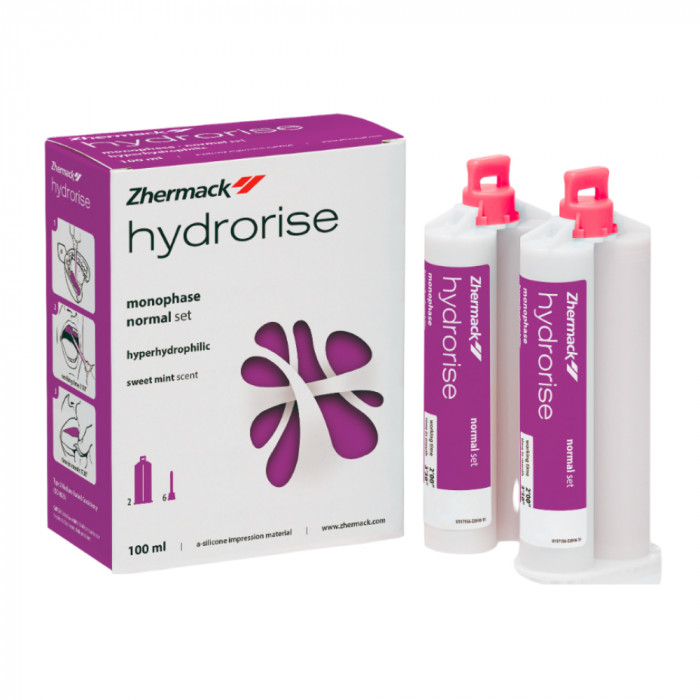 Гипергидрофильный А-силикон средней вязкости обычного отверждения Hydrorise® Monophase Normal Set (Гидрорайз Монофейс Нормал Сет) от компании Zhermack - стоматологический оттискной материал фиолетового цвета со сбалансированным набором характеристик, предназначенный для нанесения непосредственно на препарируемую область или в индивидуальную оттискную ложку с целью получения цельных однофазных оттисков для имплантации, съемного и несъемного протезирования.