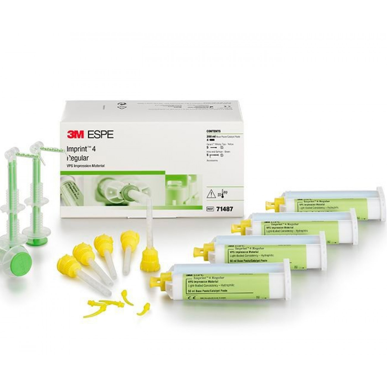 Оттискной материал Imprint 4 корригирующий, консистенция Regular (картриджи 4 шт. х 50 мл, 5 насадок для смешивания Garant, желтые, 5 внутриротовых дозаторов, зеленые).