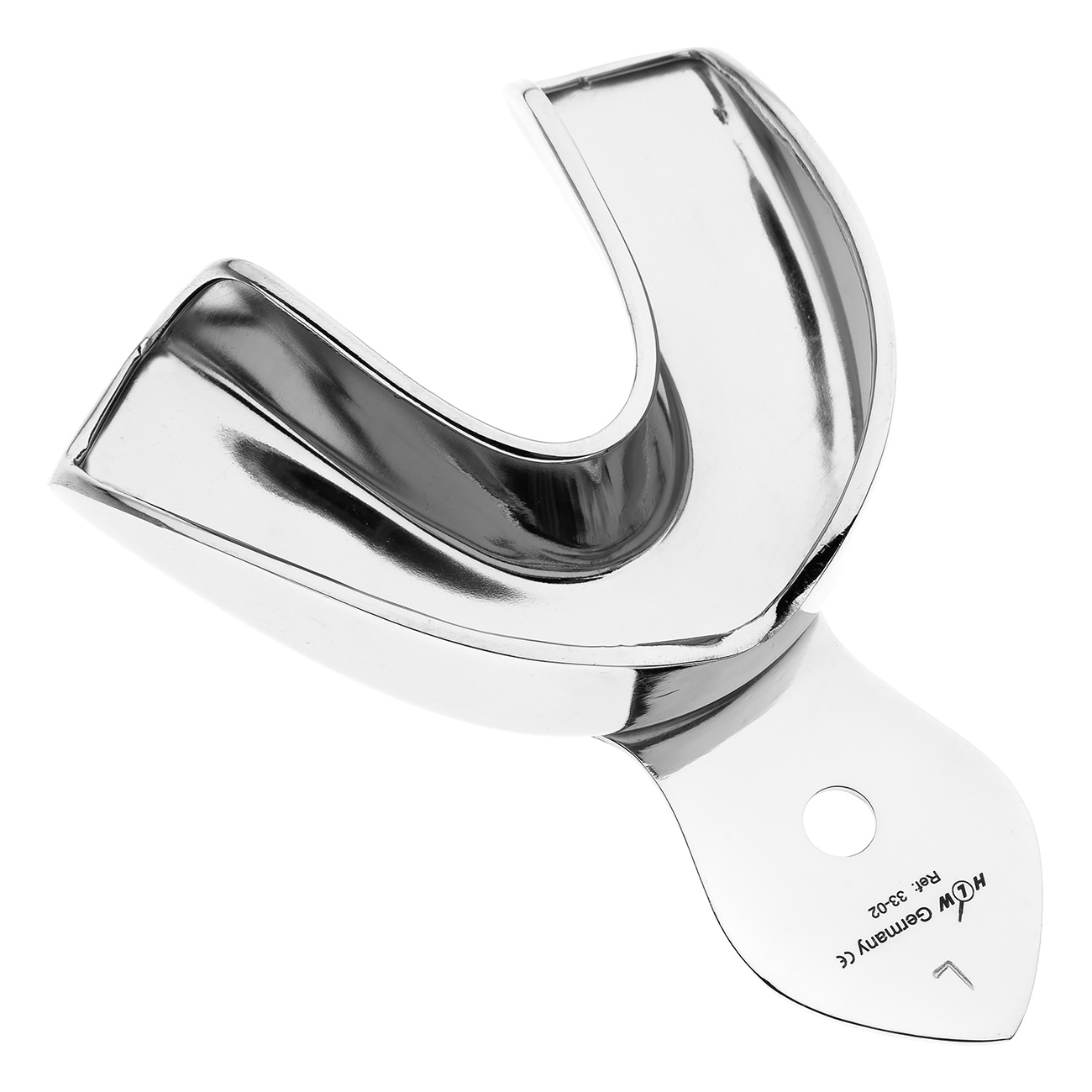 Металлическая слепочная ложка без перфорации HLW для нижнего зубного ряда предназначена для получения высокоточных оттисков из монофазных стоматологических материалов пониженной эластичности (в том числе альгинатов). По сравнению с одноразовым пластиком металл без перфорации не изгибается в ходе процедуры и обеспечивает равномерное давление на слепочный материал.
