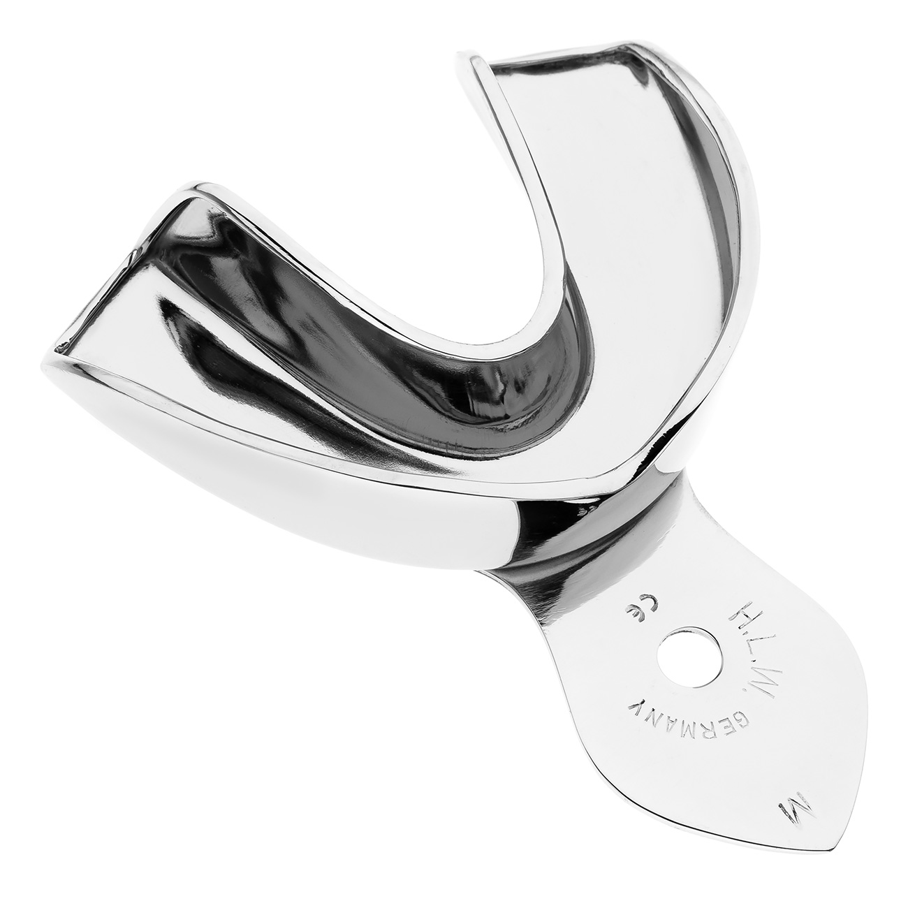 Металлическая слепочная ложка без перфорации HLW для нижнего зубного ряда предназначена для получения высокоточных оттисков из монофазных стоматологических материалов пониженной эластичности (в том числе альгинатов). По сравнению с одноразовым пластиком металл без перфорации не изгибается в ходе процедуры и обеспечивает равномерное давление на слепочный материал.