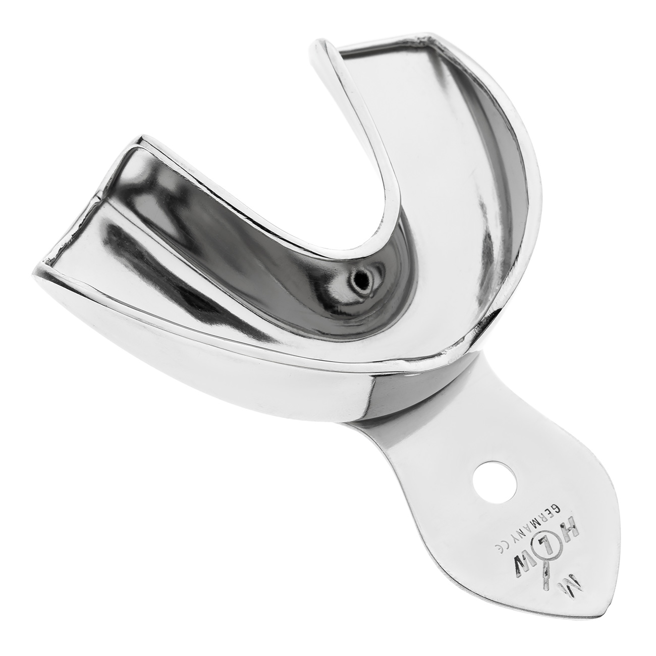 Металлическая слепочная ложка без перфорации HLW для верхнего зубного ряда предназначена для получения высокоточных оттисков из монофазных стоматологических материалов пониженной эластичности (в том числе альгинатов). По сравнению с одноразовым пластиком металл без перфорации не изгибается в ходе процедуры и обеспечивает равномерное давление на слепочный материал.
