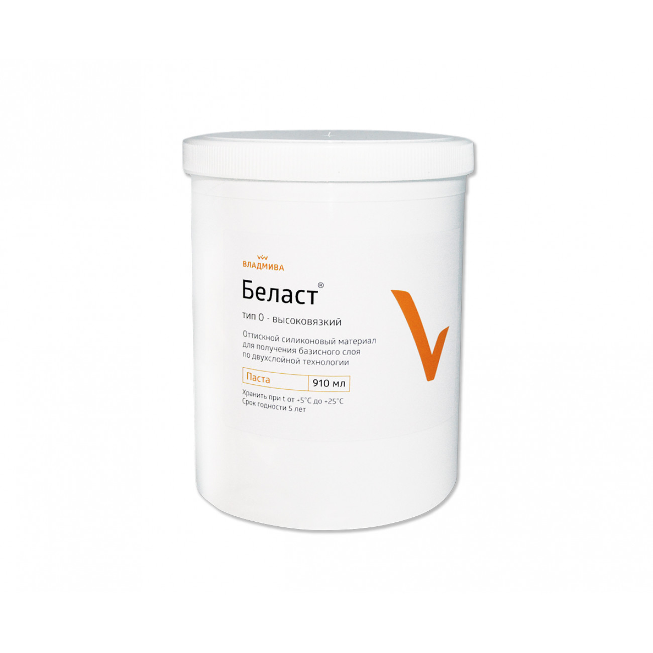 «Беласт» ВЫСОКОВЯЗКИЙ (ГОСТ 31573 , тип 0-жесткий, ИСО 4823, тип 1-мягкий)силиконовый оттискный материал, представляющий собой наполненную силиконовую композицию холодного отверждения конденсационного типа. Материал обладает оптимальной начальной консистенцией и достаточной жесткостью после отверждения (вулканизации), высокой оттискной эффективностью и эластичностью, незначительной усадкой.