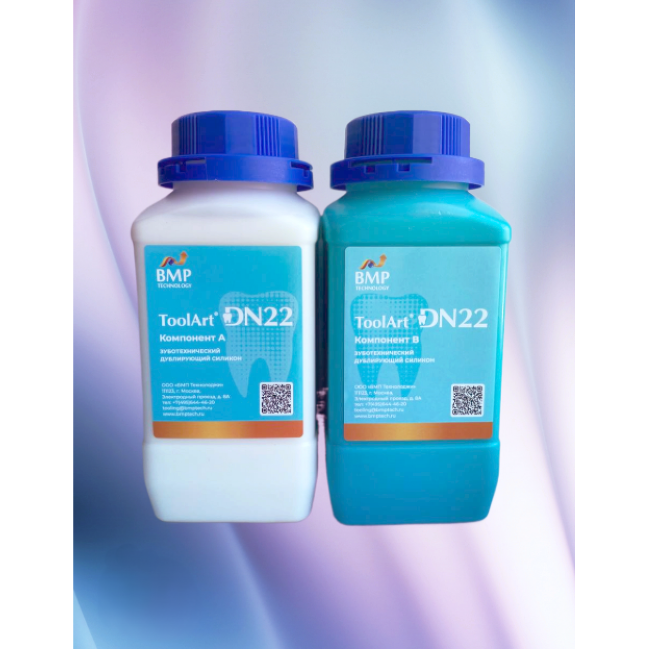ToolArt DN 22 A/B — это литьевая, вулканизирующаяся при комнатной температуре, двухкомпонентная силиконовая резиновая смесь аддитивной сшивки, предназначенная для дублирования в зуботехнической отрасли, как при работе с несъёмными, так и со съёмными протезами.