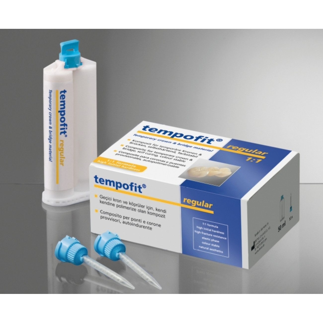 Стандартный бис-акриловый композитный материал для изготовления точных временных протезов на короткий и продолжительный срок, 1:1, самоотверждаемый. Естественная полупрозрачная эстетика зубов, с долгосрочным стабилизатором цвета. Особенная стабильность на изгиб и излом, очень устойчив к абразии. Высокая начальная твердость, короткое время отверждения. Легкое извлечение благодаря эластичной фазе, низкая температура полимеризации. Оптимально обрабатывается (резка, полировка), обладает нейтральным вкусом. Предназначается для прямого нанесения в Automix2-системе картриджей.