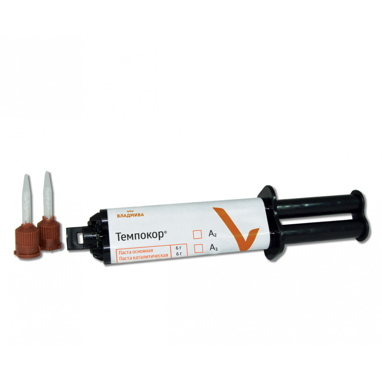 «Темпокор» - полимерный композитный материал на основе многофункциональных метакрилатов выпускается в виде двух паст (основной и каталитической) разных цветовых оттенков (А2, А3, А3,5, В2, С2, по шкале VITA).