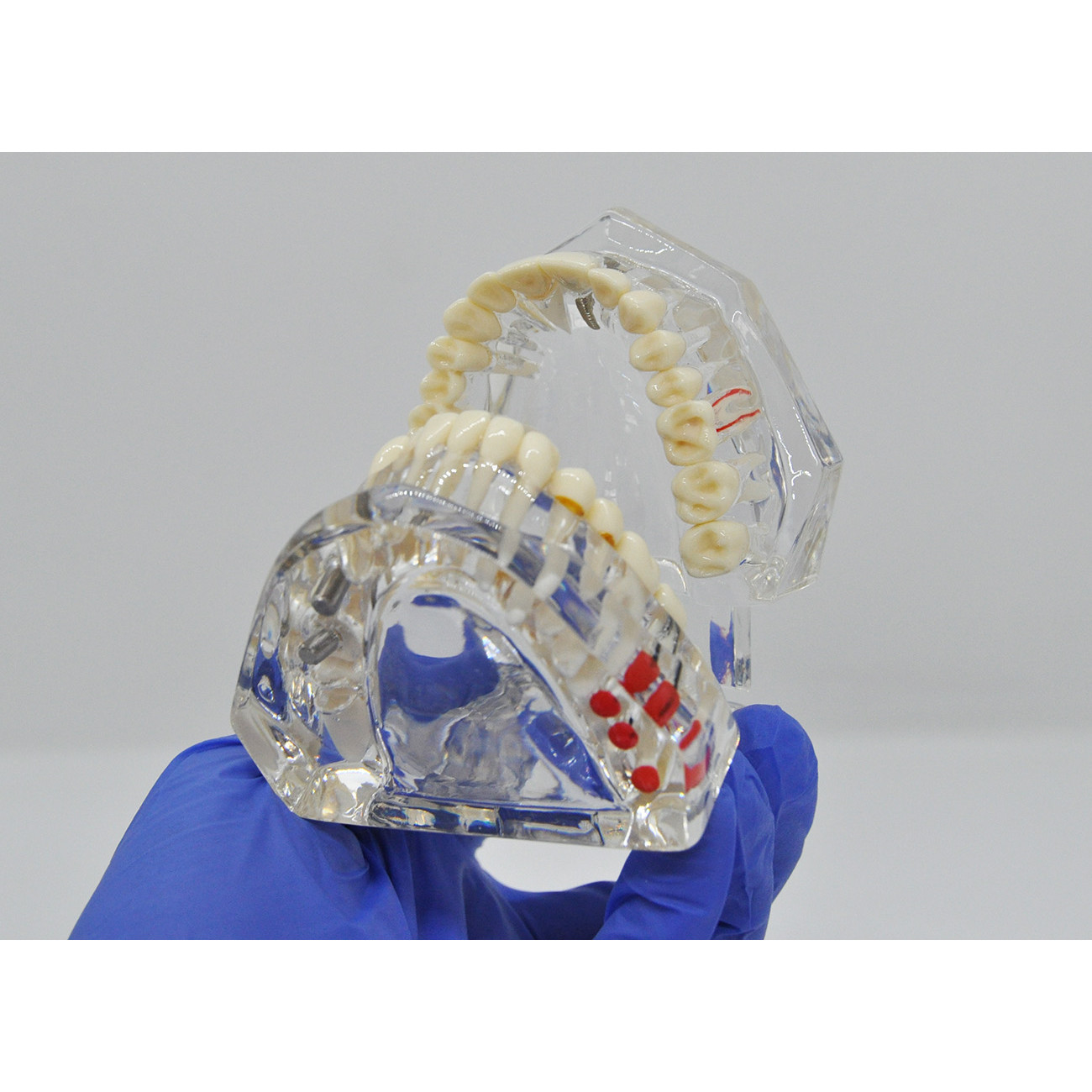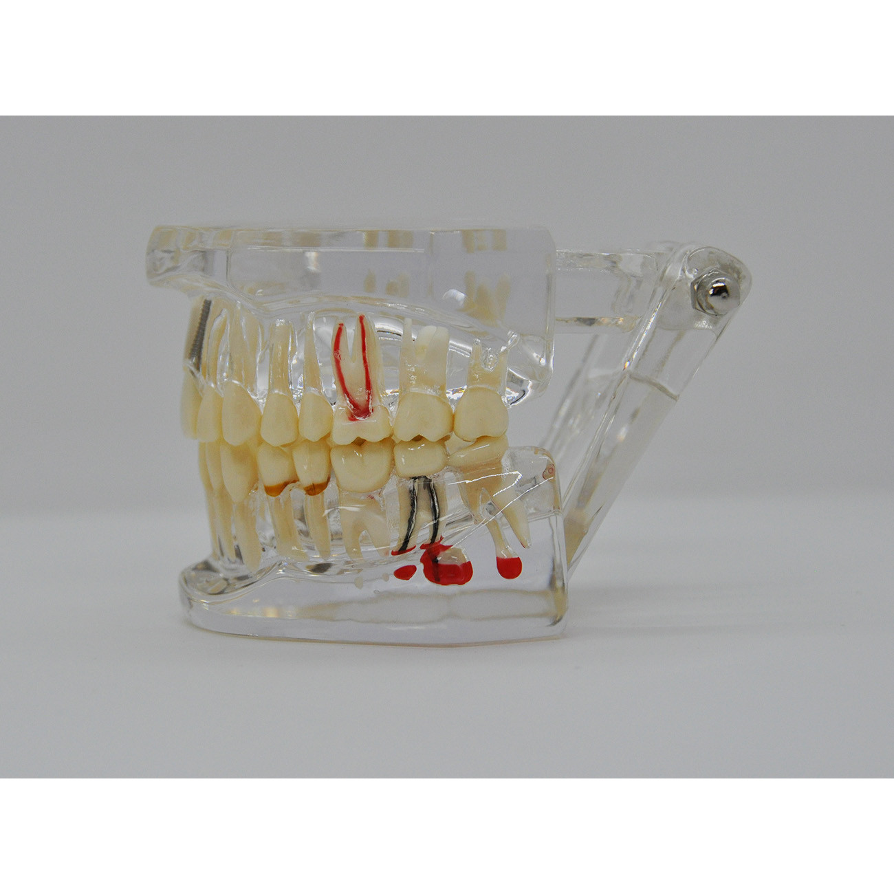 Прозрачная модель челюсти человека, разработанная для стоматологии, сочетает точность анатомического воспроизведения с функциональной наглядностью. Её прозрачная конструкция из ПВХ позволяет детально изучать структуру зубов, их корней, наличие имплантатов, протезов и мостов, а также различных зубных патологий: кариеса, пародонтоза, рецессии пульпы, кисту зуба и ретинированных зубов. Прозрачность, возможность раскрытия на 290 градусов и съёмные элементы обеспечивают полную видимость и максимальное удобство демонстрации.