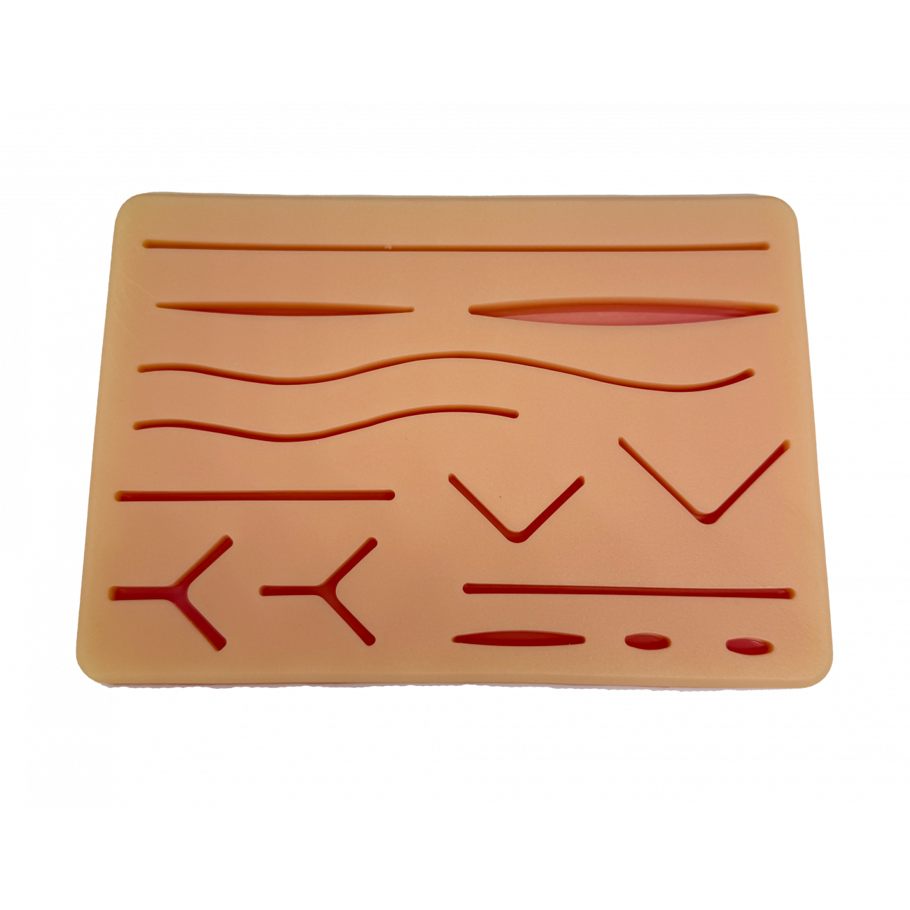 Тренажер используется для отработки навыков хирургических швов. Тренажер позволяет контролировать правильность наложения швов, в случае перетаскивания узлов, ткань может прорезываться. Изготовлен коврик из силикона высокого качества и по упругости похож на кожу человека, имеет 3 слоя тренировочной площадки: кожа, жировой слой и мышцы, что дает возможность отработки навыков наложения швов на рану различной классификации и размера. Глубина разрезов составляет 1,5 см, ширина разрезов от 2 до 8 мм. Материал прочный, долговечный, легко моется. Размер коврика 12 х17 см.