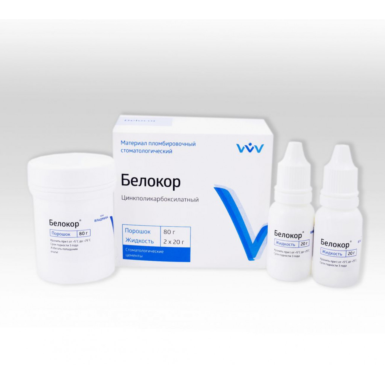 Цемент «Белокор» образуется при смешивании порошка и жидкости. Порошок представляет собой модифицированную окись цинка, жидкость - водный раствор полиакриловой кислоты.