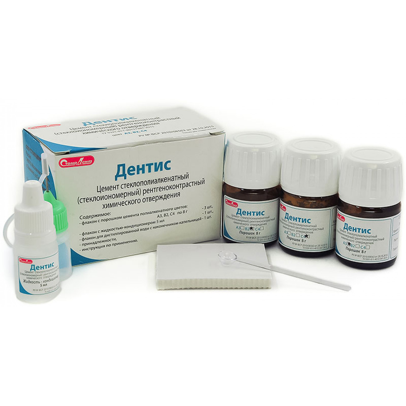 ДЕНТИС универсальный стеклоиономерный цемент для подкладок и реставрации. 3 флакона по 8 г (цвета А3; В2; С4), кондиционер 5 мл, принадлежности.