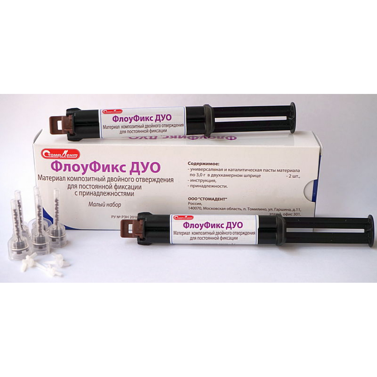Материал композитный двойного отверждения «ФЛОУФИКС ДУО» заполнен на 50% весовых специально подготовленным стеклонаполнителем, мономерная матрица состоит из: Бис-Гма, уретан диметакрилат, олигокарбонатметакрилат, инициаторы, активаторы, бисфенол-А диметакрилат.