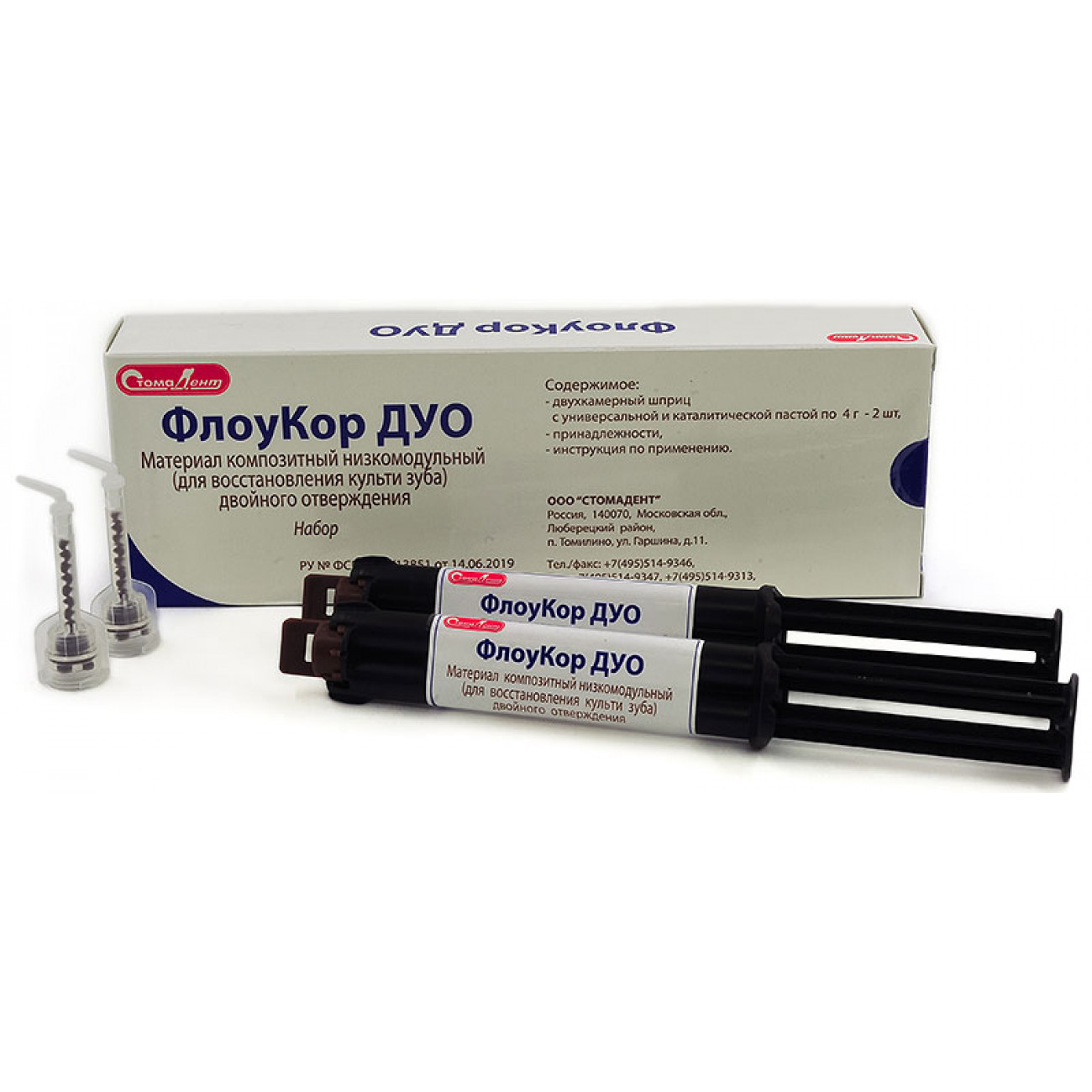 ФЛОУКОР ДУО НАБОР композитный текучий материал двойного отверждения для восстановления культи зуба и фиксации стекловолоконных и анкерных штифтов, 2 двухкамерных шприца по 8 г, принадлежности.