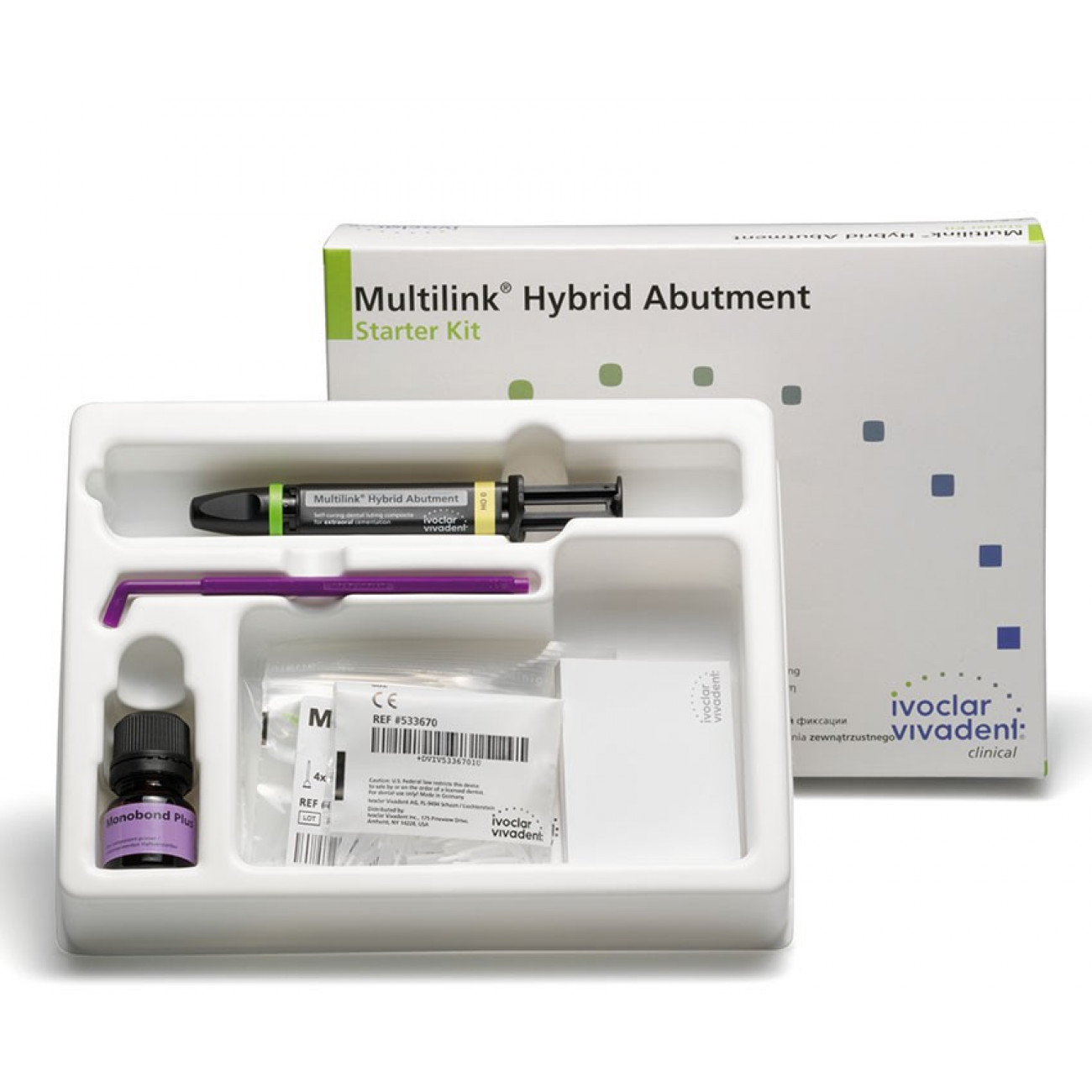 Мультилинк Гибрид Абатмент Стартовый набор -это набор в который входит уникальный самотвердеющий композитный цемент для постоянной фиксации (склеивания) керамических структур из стеклокерамики из дисиликата лития (LS2) или оксида циркония сосновой (например, абатментом) из титана / сплава титана или оксида циркония для изготовления гибридного абатмента или гибридного абатмента-коронки.