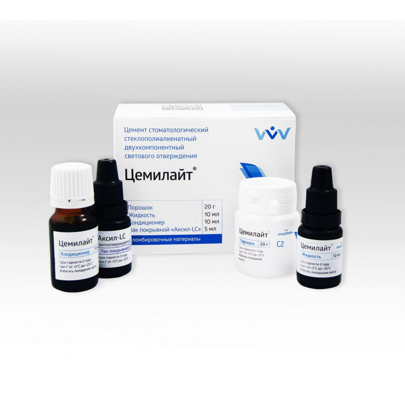 Стеклоиономерный цемент светового отверждения «Цемилайт» выпускается в виде комплекта порошок-жидкость, обладает высоким химическим сродством как к полимерным материалам, так и к тканям зуба, обеспечивает надежное краевое прилегание.