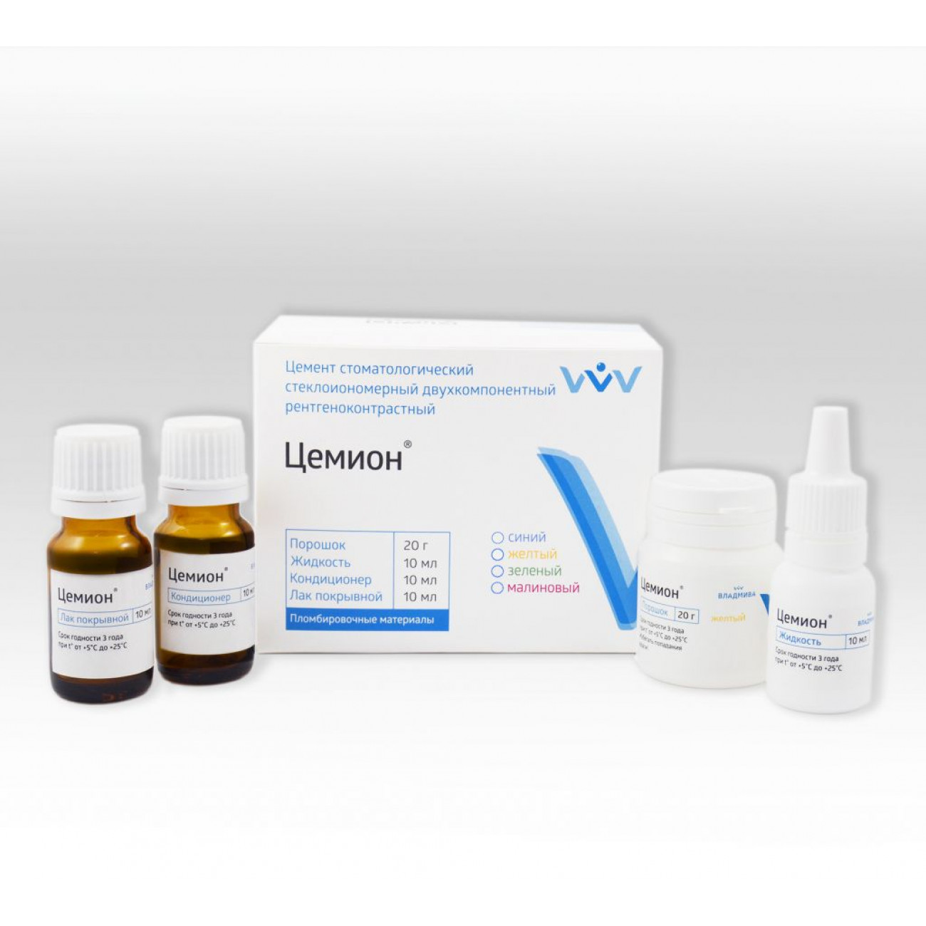 Материал «Цемион» – традиционный стеклоиономерный цемент химического отверждения, обладающий химической адгезией к дентину и эмали. Пломбировочный материал «Цемион» образуется при смешивании порошка и жидкости. Порошок представляет собой измельченное алюмофторсиликатное стекло, жидкость — водный раствор модифицированной полиакриловой кислоты.
