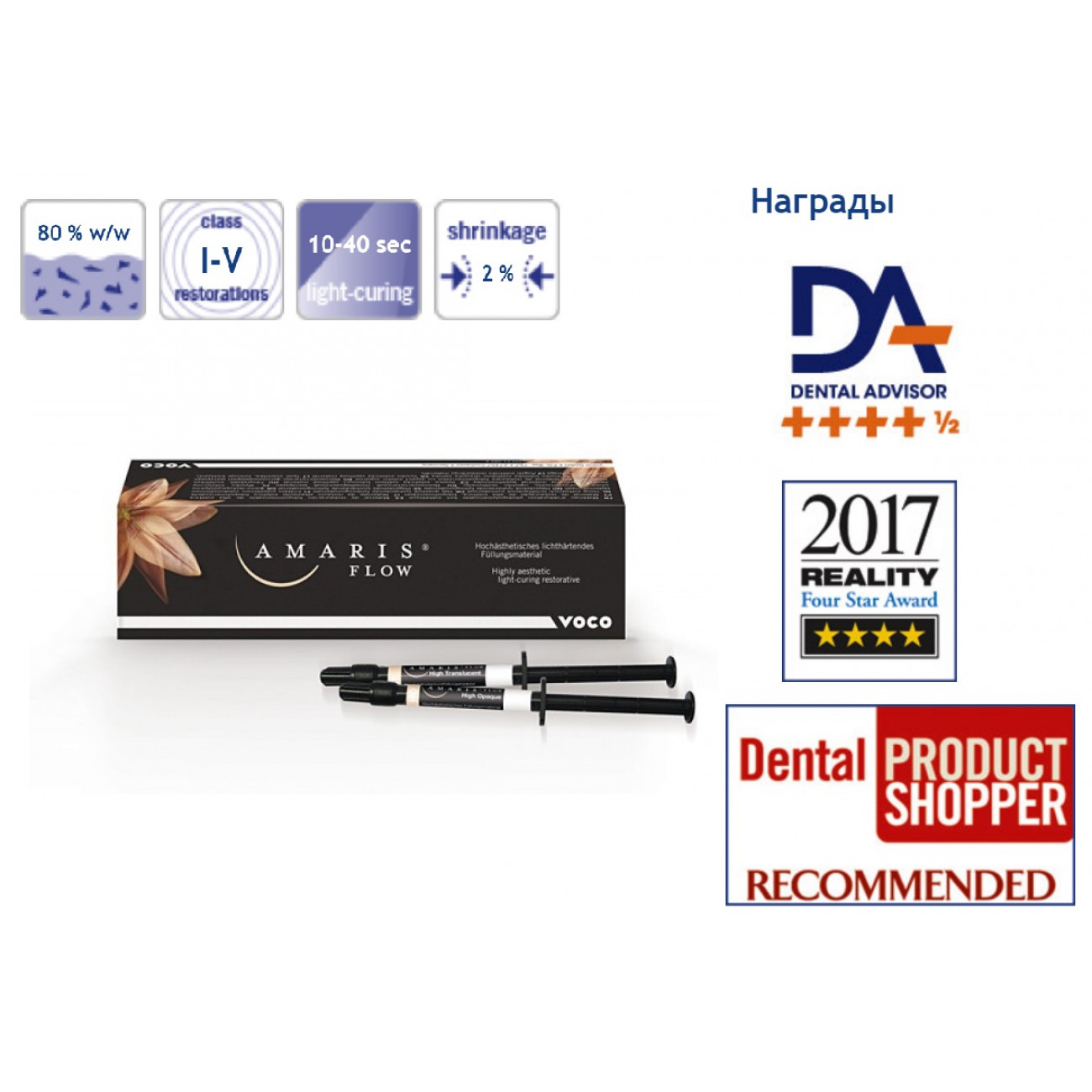 Основой многокомпонентной реставрационной системы Амарис® является рентгенконтрастный высоконаполненный (80 % по весу) композитный мате- риал нового поколения, основанный на современной малоусадочной метакри- латной матрице (БИС-ГМА, УДМА, ТЕГДМА). Амарис® полимеризуется под действием видимого синего света любых галогеновых, а также светодиодных ламп. Амарис® можно совмещать с любыми современными адгезивными си- стемами, включая 6 и 7 поколения, предназначенными для бондинга свето- отверждаемых реставрационных материалов.
