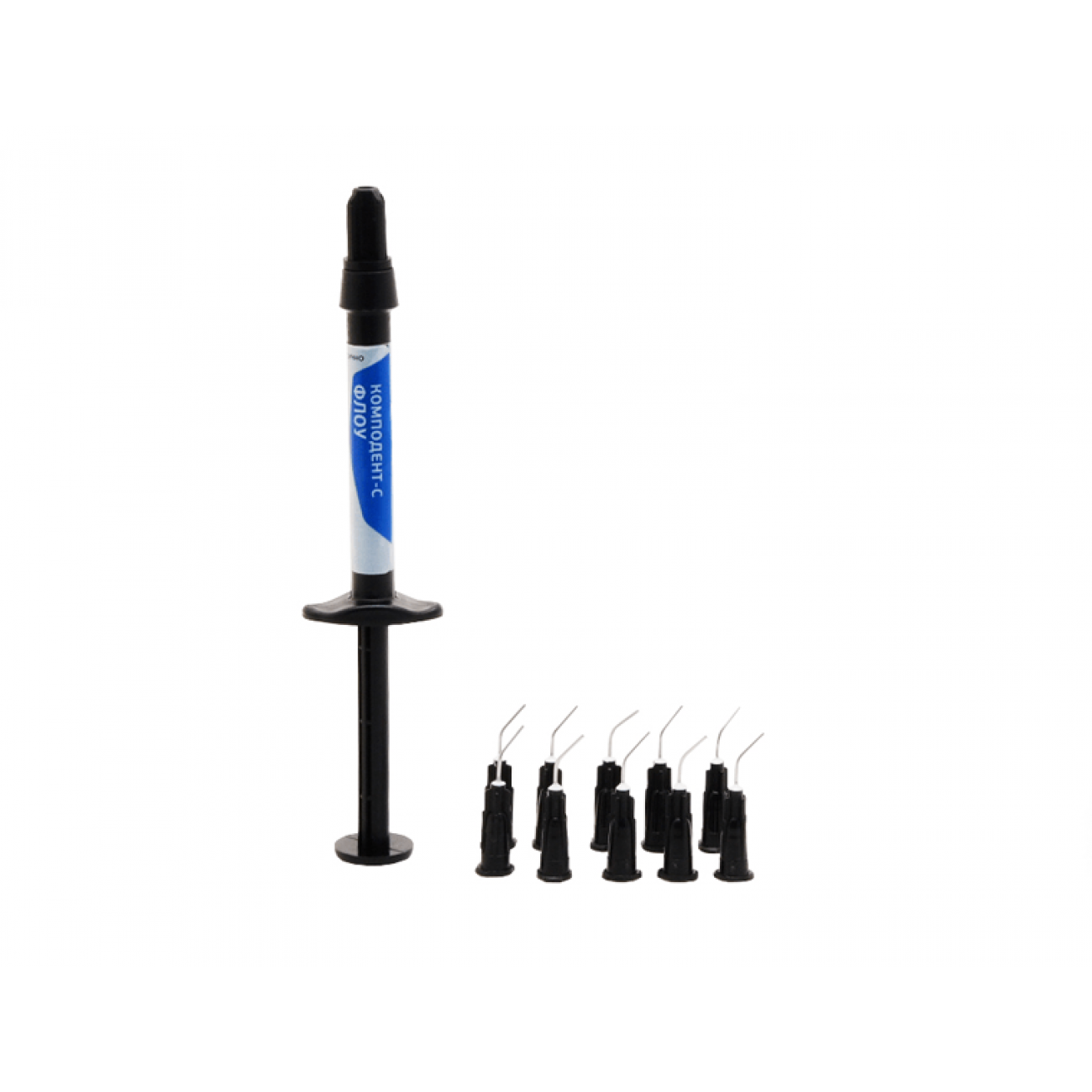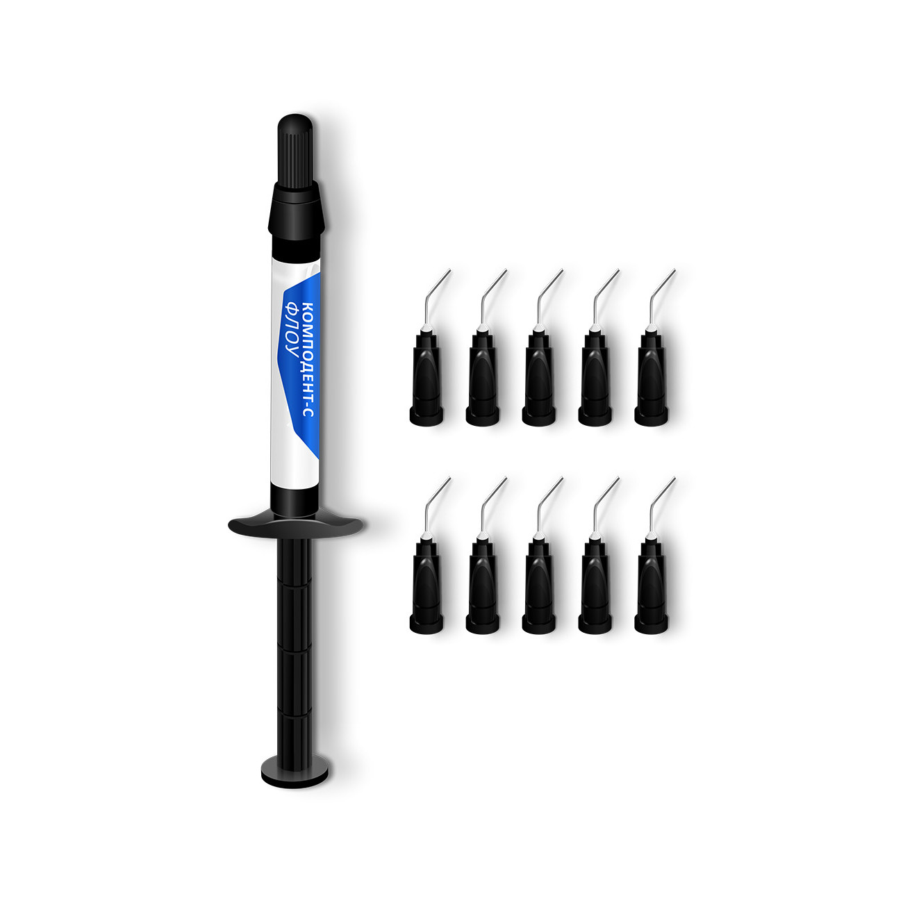 "Комподент-С Флоу" — жидкотекучий нанокомпозит светового отверждения и низкой вязкости, созданный для высокоточной реставрации зубов в терапевтической стоматологии. Материал сочетает в себе исключительную текучесть, позволяющую заполнять даже микроскопические трещины и сложные полости, и высокую прочность благодаря высокому содержанию неорганического наполнителя. Это делает его идеальным для пломбирования полостей различных классов, включая минимально инвазивные, а также для герметизации фиссур, ремонта керамических и композитных реставраций, шинирования подвижных зубов при пародонтите. Низкая полимеризационная усадка минимизирует риск микроподтеканий и отрыва адгезива, снижая постпломбировочную чувствительность. Совместимость с композитами других производителей позволяет использовать его в качестве базовой прокладки или финишного слоя. Материал отверждается под галогеновыми или светодиодными лампами (400–500 нм), после чего легко шлифуется и полируется до гладкой поверхности. Рентгеноконтрастность упрощает контроль качества реставрации.