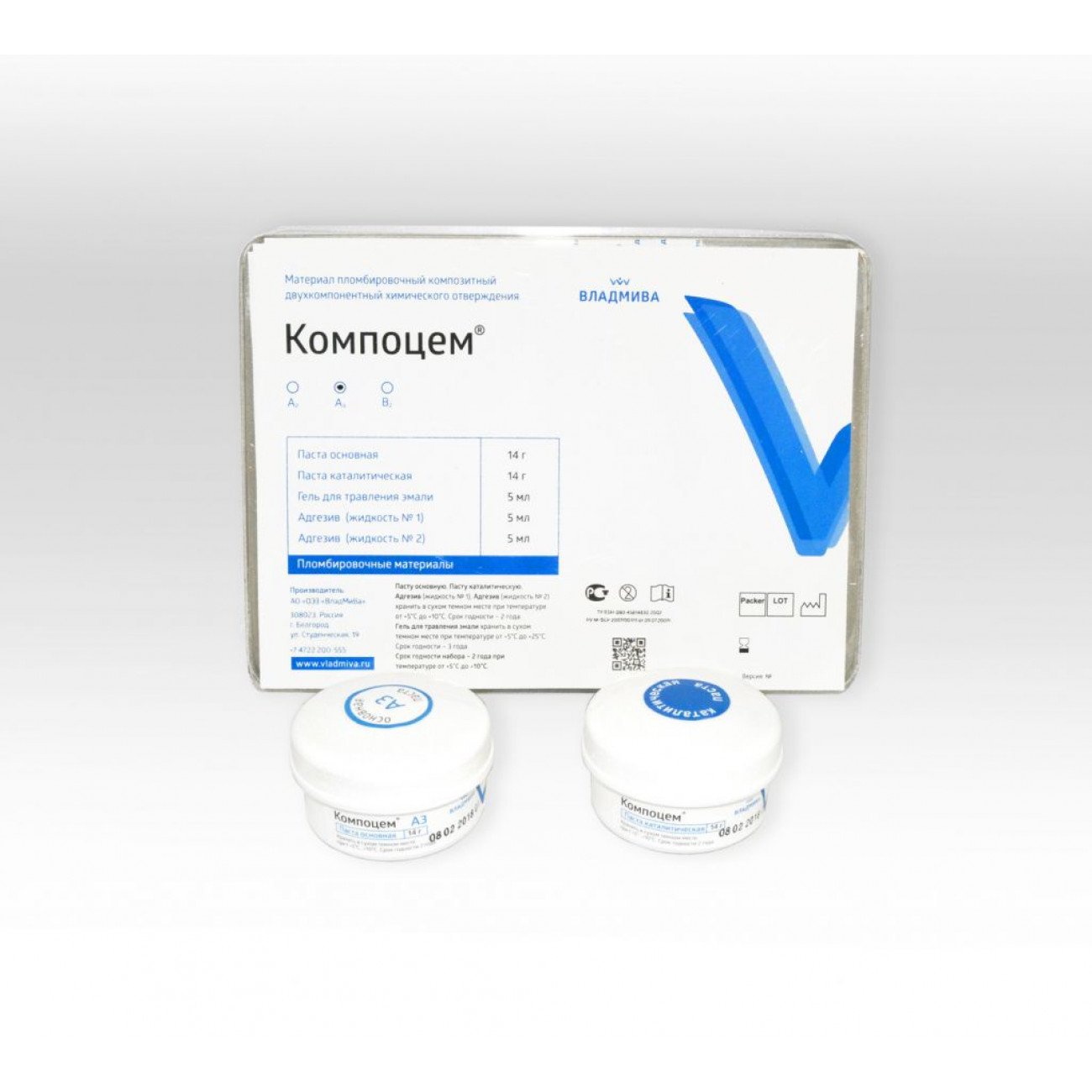 «Компоцем» выпускается в виде двух паст (основной и каталитической) разных цветовых оттенков по шкале VITA (А2, А3, В2). Полученный в результате смешивания равных количеств паст пломбировочный материал, обладает высокой механической прочностью, стабильностью и низкой растворимостью в ротовой жидкости, устойчивостью к истиранию.