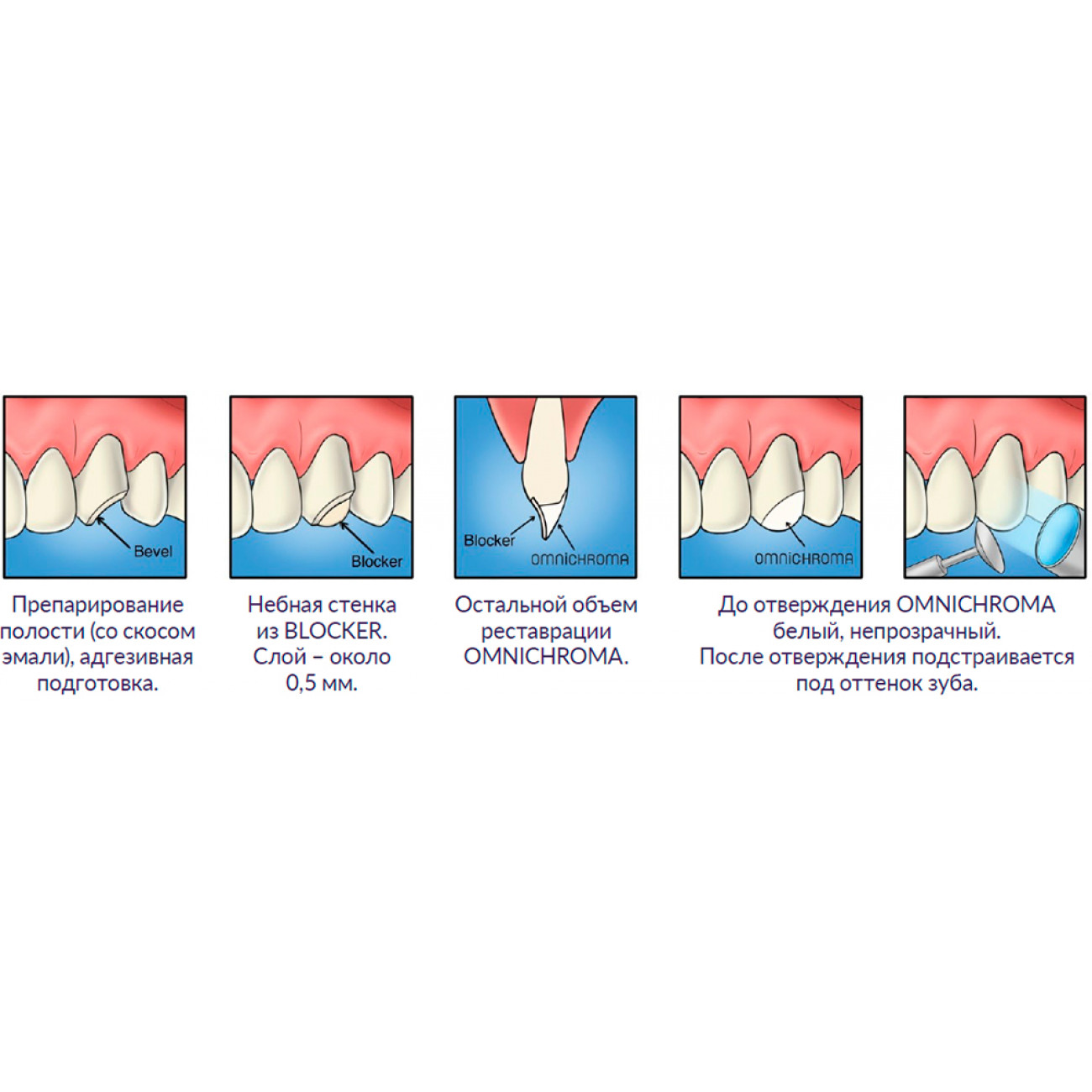 Вспомогательный материал — маскировочный агент. OMNICHROMA BLOCKER маскирует фоновый цвет. Широкий спектр полостей поддается лечению с помощью наполнителя OMNICHROMA в сочетании с материалом BLOCKER или иным цветомаскирующим материалом.