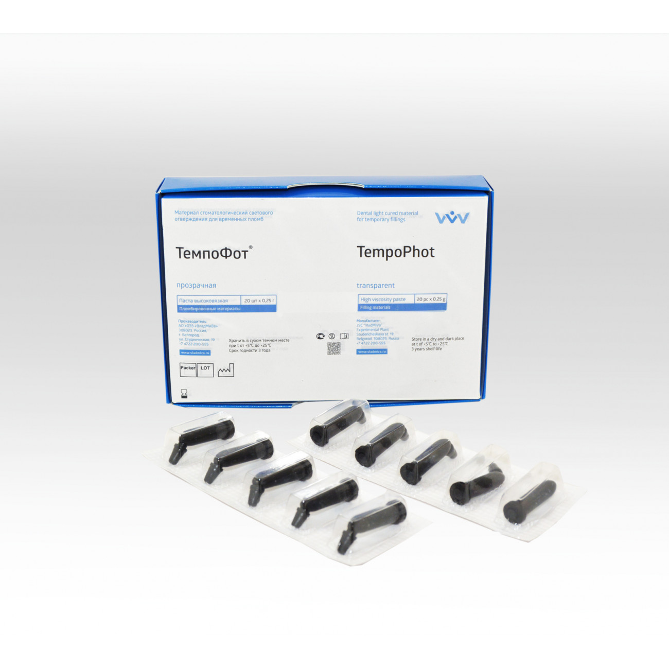 Материал «ТемпоФот» выпускается в виде пасты (прозрачной и синей), в состав которой входят: активаторы светового отверждения; стабилизаторы; технологические добавки, обеспечивающие оптимальную консистенцию; бактерицидное вещество (хлорид бензалкония), которое оказывает микробостатическое и микробоцидное действие на бактерии и кандиды.