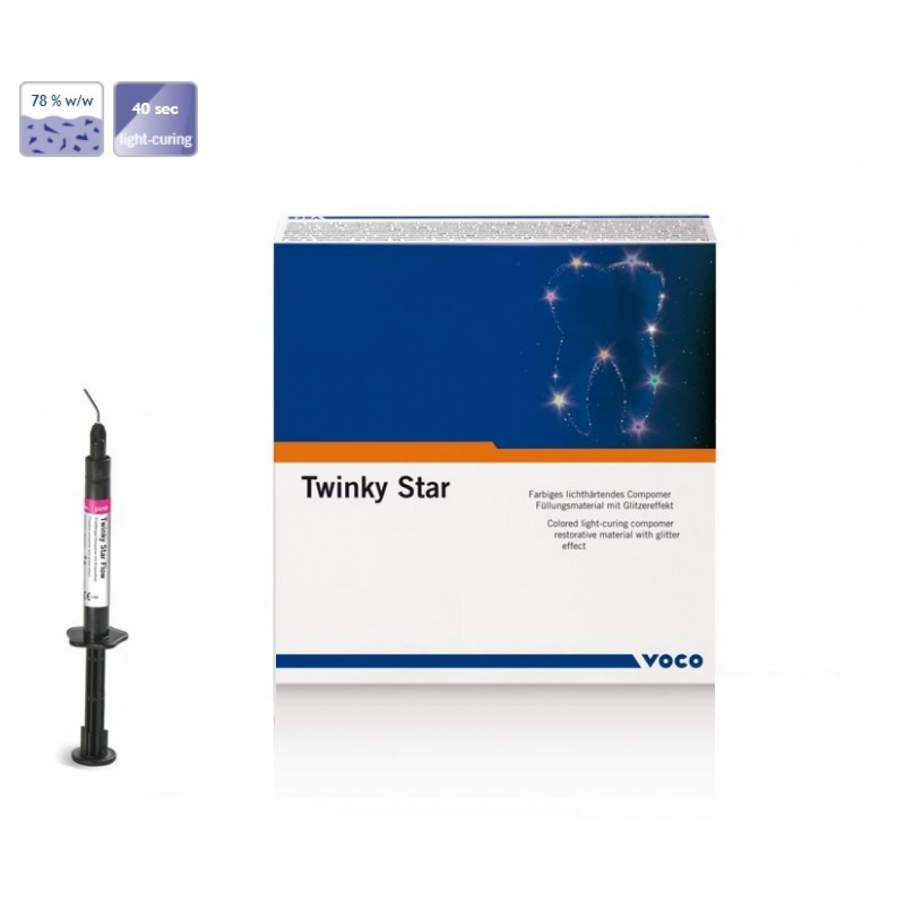 Twinky Star цветной, светоотверждаемый, рентгеноконтрастный пломбировочный материал с эффектом блеска при пломбировании молочных зубов.