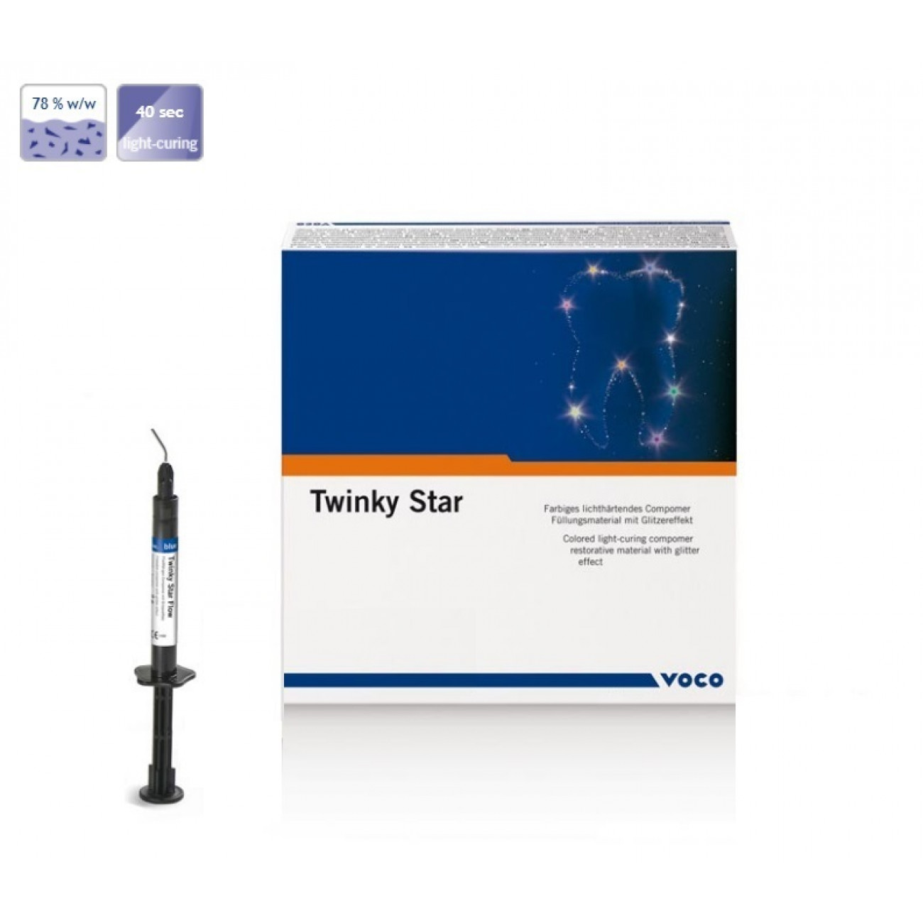 Twinky Star цветной, светоотверждаемый, рентгеноконтрастный пломбировочный материал с эффектом блеска при пломбировании молочных зубов.
