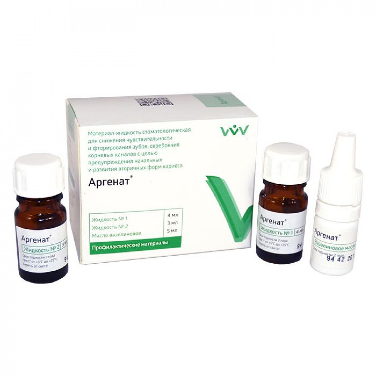 «Аргенат» двухкомпонентный - предназначен для серебрения инфицированных и труднопроходимых каналов, кариозных молочных зубов, а также зубов, пораженных пришеечным кариесом.