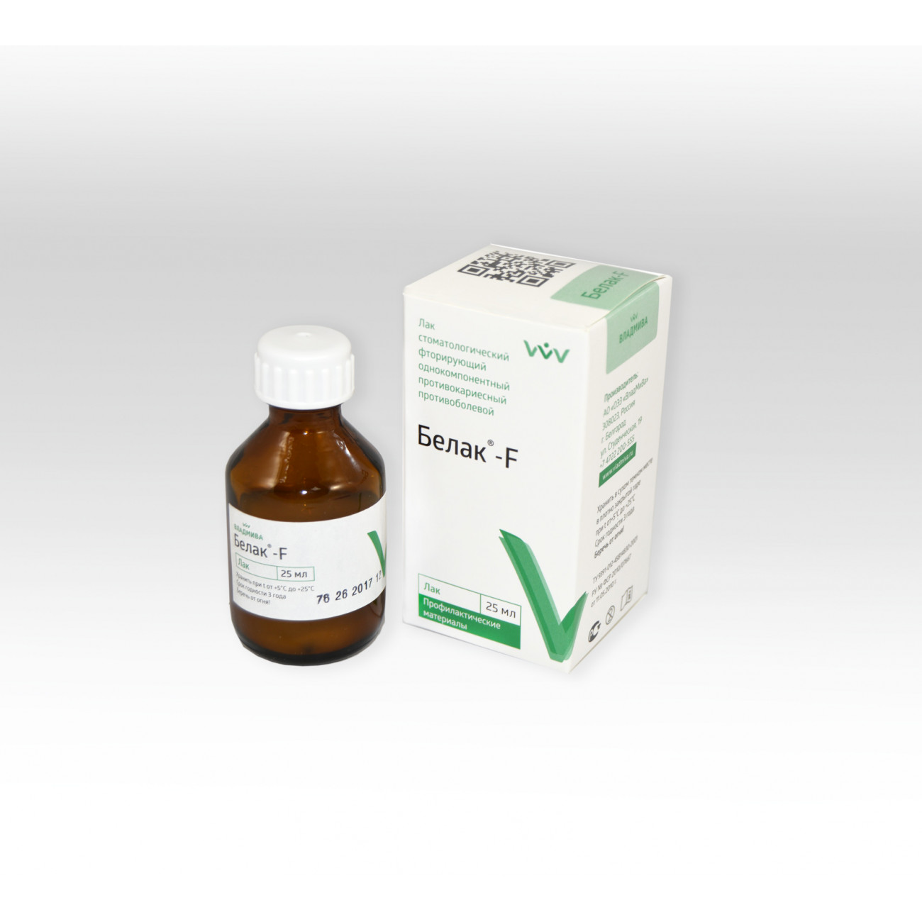 «Белак-F» белый. В его состав входят растворитель, пленкообразователь, калий фтористый. Ионы фтора, содержащиеся в препарате, укрепляют эмаль зубов, снижают ее проницаемость, предохраняют зубы от развития кариеса.