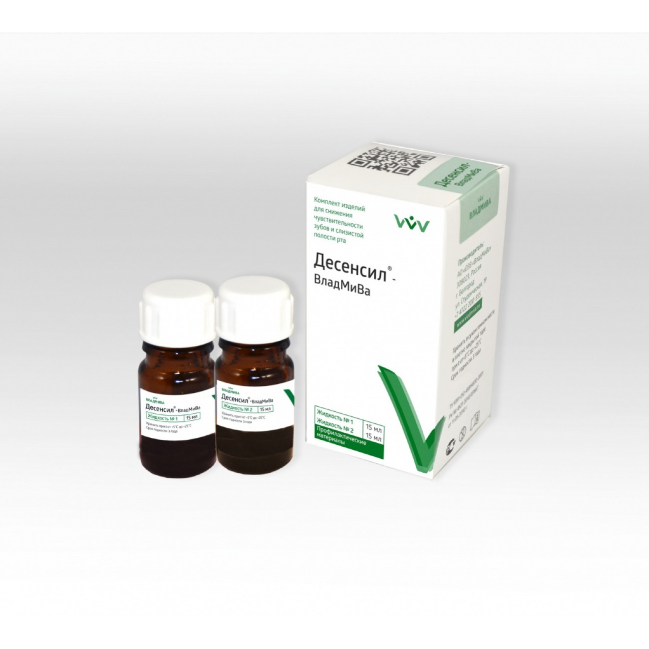 Жидкости «Десенсил-ВладМиВа» №1 и №2 в совместном применении являются простым и эффективным средством для снижения чувствительности зубов. Жидкость №1- раствор, содержащий фосфат, карбонат-калия и антисептик. Жидкость №2 - раствор солей кальция и стронция.