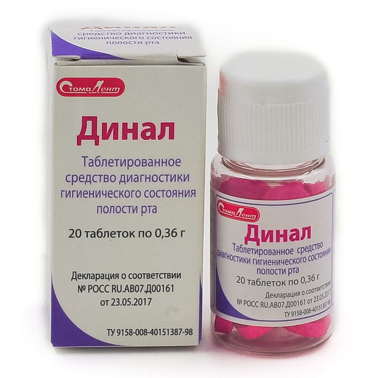 НАЗНАЧЕНИЕ. «Динал» - таблетированное средство для определения мягкого зубного налета на поверхности зубов. Используется при обучении гигиенической чистке зубов.