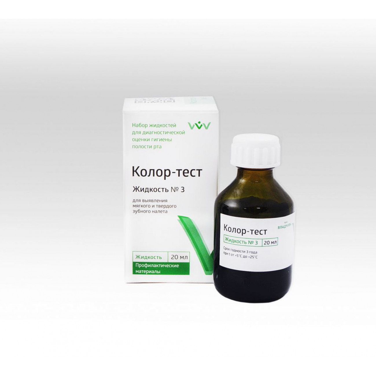 «КОЛОР-ТЕСТ №3» — предназначен для выявления мягкого и твердого зубного налета и оценки гигиены полости рта врачом или самостоятельно пациентом в домашних условиях.