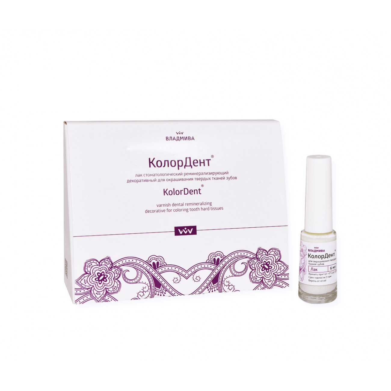 Лак «КолорДент» содержит: природный пленкообразователь, способный образовывать тонкую прочную пленку, обладающий антисептическими и бактерицидными свойствами; растворитель; загуститель; колеровочную пасту на основе диоксида титана или пигментов другого цвета, а также реминерализирующую добавку (гидроксиапатит), способствующую восстановлению минеральной структуры зуба.