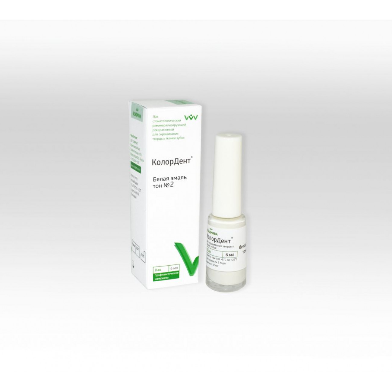 Лак «КолорДент» содержит: природный пленкообразователь, способный образовывать тонкую прочную пленку, обладающий антисептическими и бактерицидными свойствами; растворитель; загуститель; колеровочную пасту на основе диоксида титана или пигментов другого цвета, а также реминерализирующую добавку (гидроксиапатит), способствующую восстановлению минеральной структуры зуба.