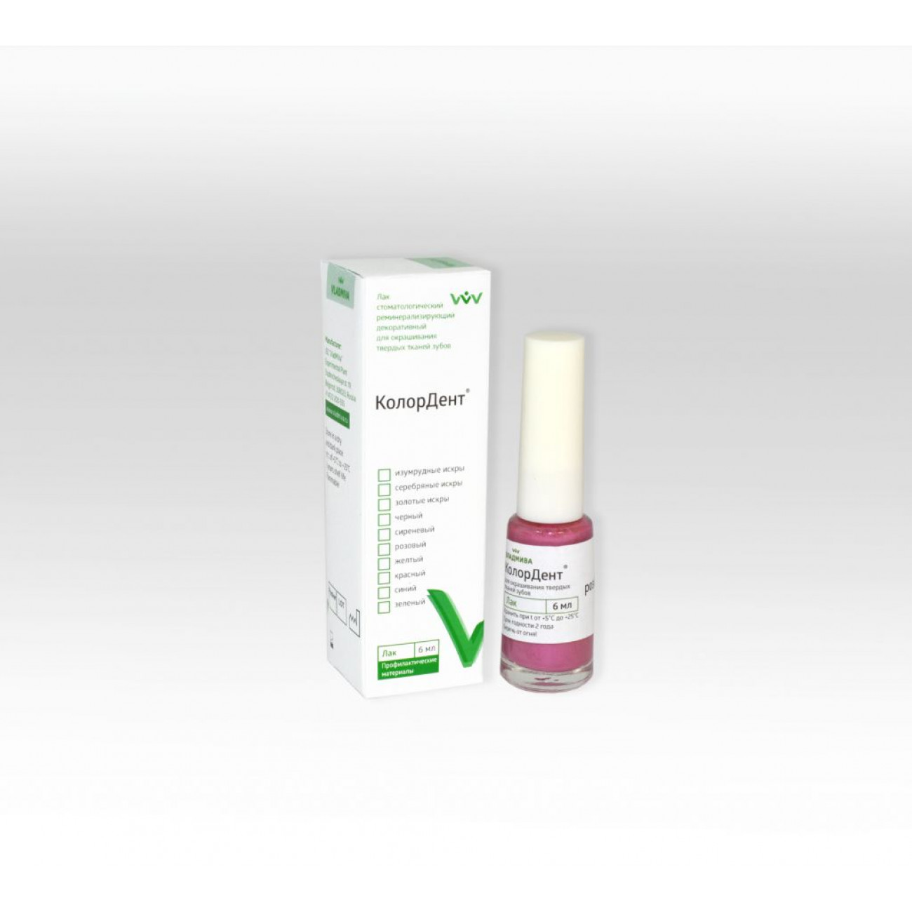 Лак «КолорДент» содержит: природный пленкообразователь, способный образовывать тонкую прочную пленку, обладающий антисептическими и бактерицидными свойствами; растворитель; загуститель; колеровочную пасту на основе диоксида титана или пигментов другого цвета, а также реминерализирующую добавку (гидроксиапатит), способствующую восстановлению минеральной структуры зуба.