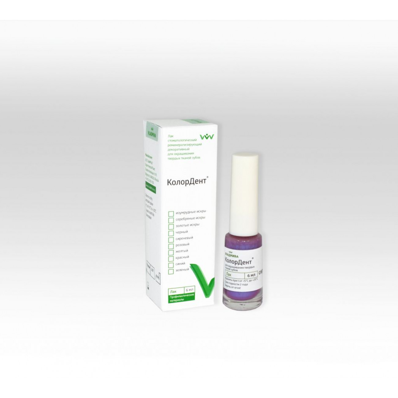 Лак «КолорДент» содержит: природный пленкообразователь, способный образовывать тонкую прочную пленку, обладающий антисептическими и бактерицидными свойствами; растворитель; загуститель; колеровочную пасту на основе диоксида титана или пигментов другого цвета, а также реминерализирующую добавку (гидроксиапатит), способствующую восстановлению минеральной структуры зуба.