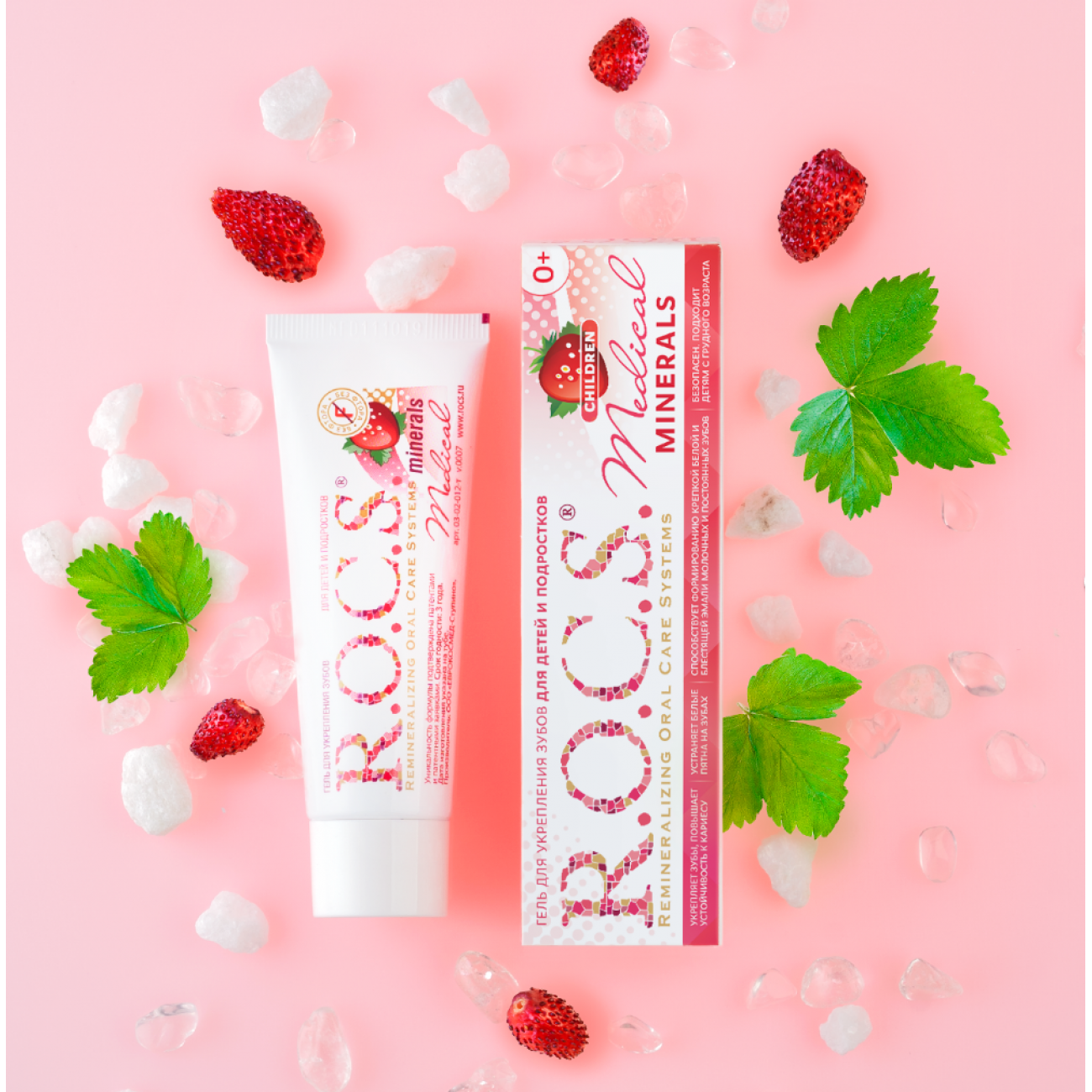 Уникальный реминерализующий гель для укрепления зубов R.O.C.S. «Medical Minerals» со вкусом клубники является богатым источником биологически доступных соединений фосфора, кальция и магния. Гель не имеет возрастных ограничений в использовании; главным образом, он ориентирован на подростков и детей в возрасте от 0 лет. Эффективность запатентованной формулы R.O.C.S. «Medical Minerals» доказана исследованиями. Продукт не содержит фтор, обеспечивает бережный уход за полостью рта и защиту от кариеса; в течение короткого времени восстанавливает прочность и белизну эмали, устраняет эстетические недостатки и т.д.; безопасен при проглатывании.