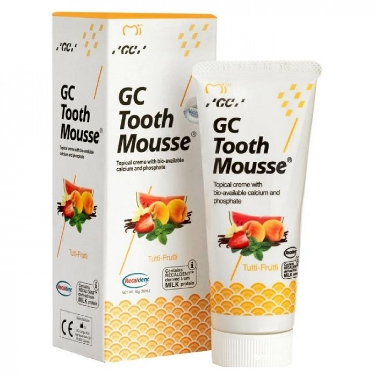 Реминерализующий водорастворимый гель для зубов без фтора Джи Си Тус Мусс содержит био-доступный фосфор и аморфный кальций, необходимый для укрепления эмали и защиты твердых тканей зубов от кислообразующих бактерий. В полости рта реминерализующий препарат GС Tooth Mousse прочно связывается с био пленкой, зубным налетом, бактериями, гидроксиапатитом и мягкими тканями, нейтрализуя кислоты любого происхождения и усиливая слюноотделение. Чем дольше гель находится в полости рта, тем эффективнее результат. Гель не содержит фторидов и может применяться в детской стоматологии.