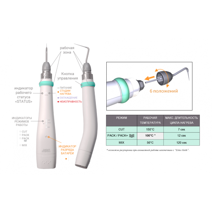 Регулировка рабочей температуры наконечника при совместной работе с блоком управления ESTUS MULTI: от 160 до 200°С (шаг 10°С)