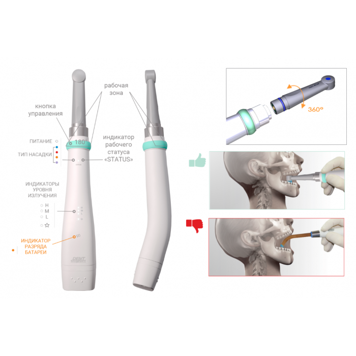 Превосходные эргономические характеристики благодаря малому весу и сбалансированному положению наконечника в руке врача, расположению органов индикации в непосредственной близости от рабочей зоны