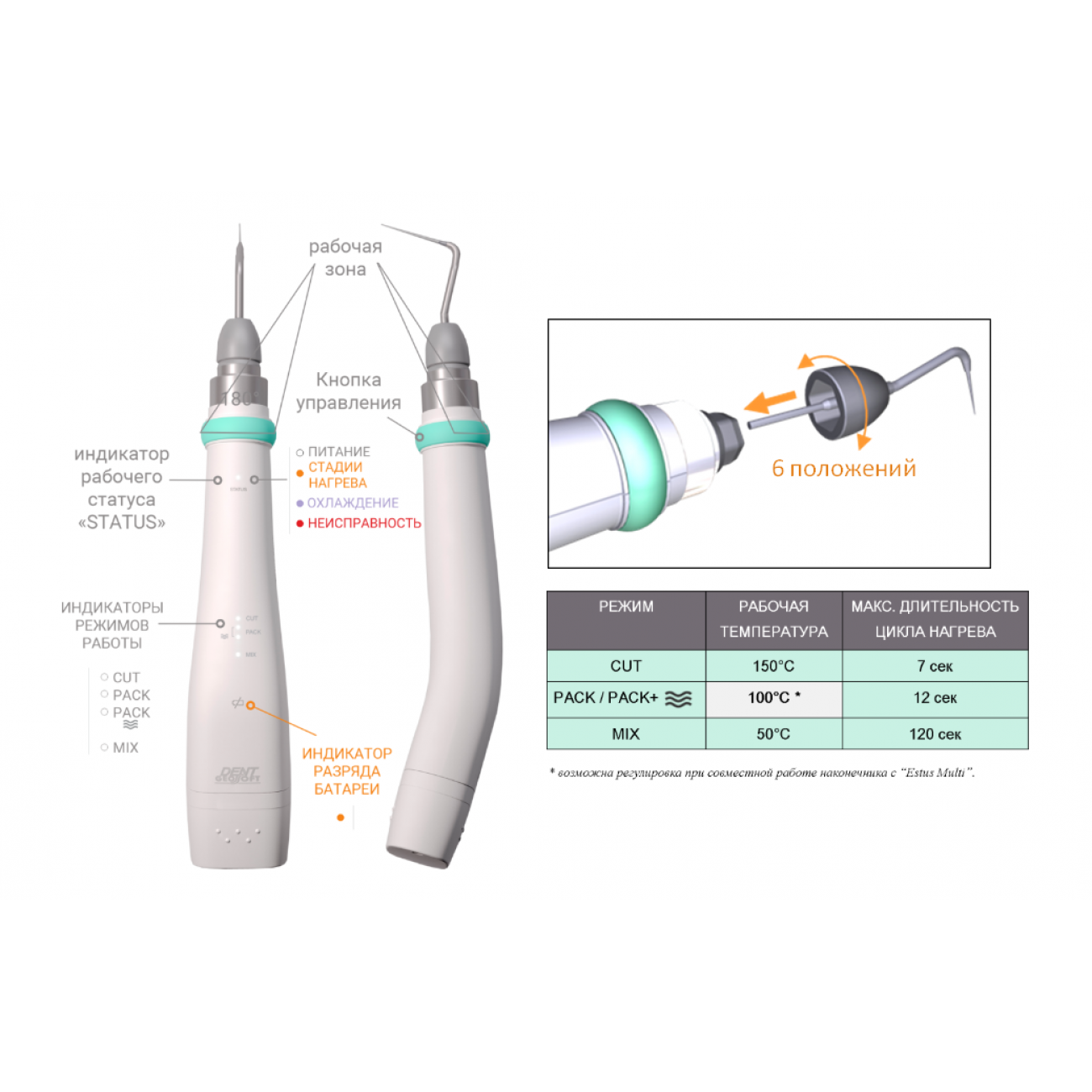 Рабочая температура Estus Pack в режимах: 1. обрезания гуттаперчи «CUT» — 150 ±10 °С, 2. конденсации гуттаперчи «PACK» — 100 ±10 °С , 3. тепловой активации ирриганта «MIX» — 50 ±5 °С