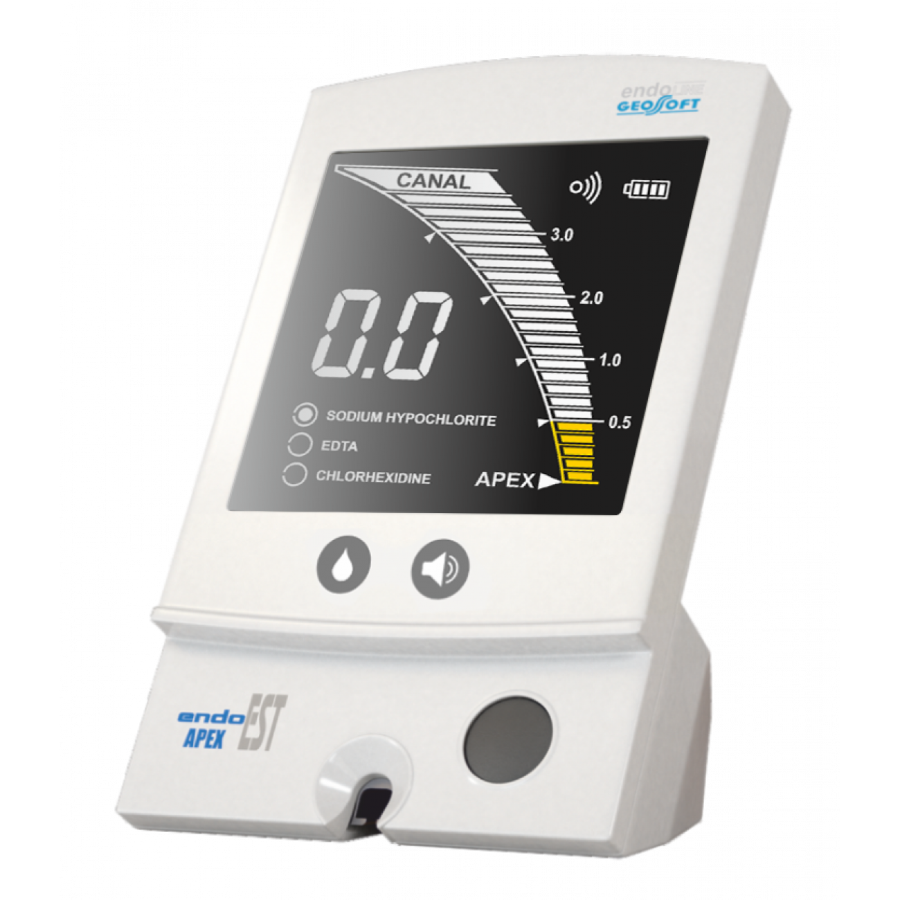 Эндодонтический Апекслокатор ЭндоЭст Апекс-02 С от компании Геософт осуществляет локализацию верхушки корня зуба путем измерения комплексного электрического сопротивления между двумя электродами. Один из электродов представляет собой металлический крючок (загубник), размещаемый на губе пациента, а другой электрод (щуп) присоединяется к металлической части эндодонтического инструмента (файлу), введенного в корневой канал исследуемого зуба.