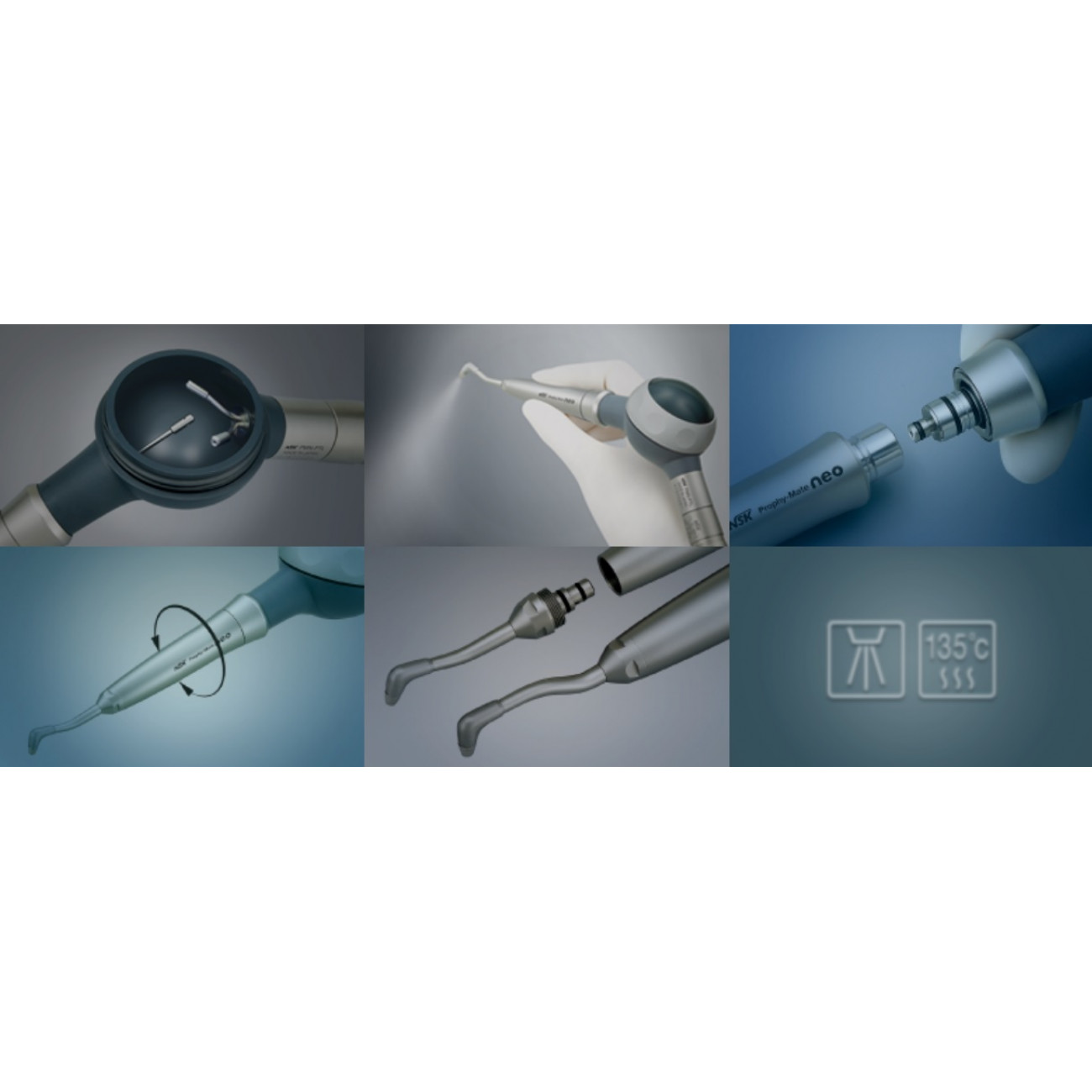 Усовершенствованная система Prophy-Mate neo – это удобство форм и отличная функциональность. Легкость, yпрекрасная балансировка, компактная камера для порошка, наконечник NSK, вращающийся на 360° даже при высоком давлении, делают данную систему отличным инструментом для врача. Данная система сокращает время снятия зубного камня и налета. Имеются насадки с углом 60° и 80°.